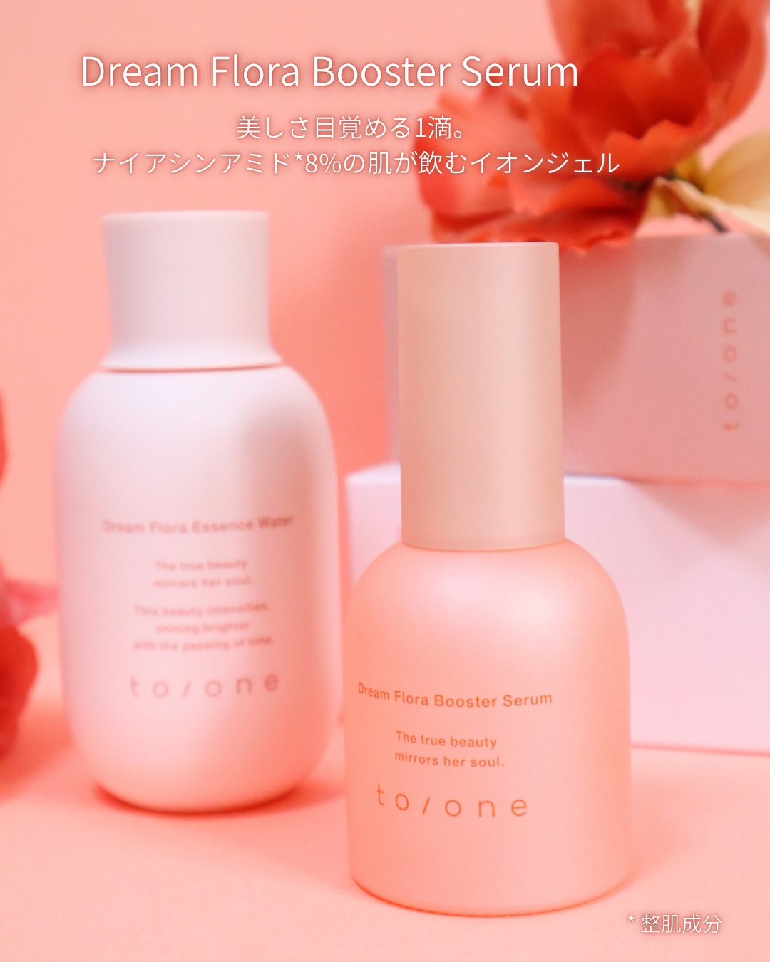 @toonecosmeticsto/oneのスキンケア新ライン"フローラシリーズ"トーンドリームフローラブースターセラム◻︎ナイアシンアミドを8%と高配合◻︎素早く浸透*1する独自のイオンジェル◻︎セラミドナノカプセル*2が角層のうるおいを長...