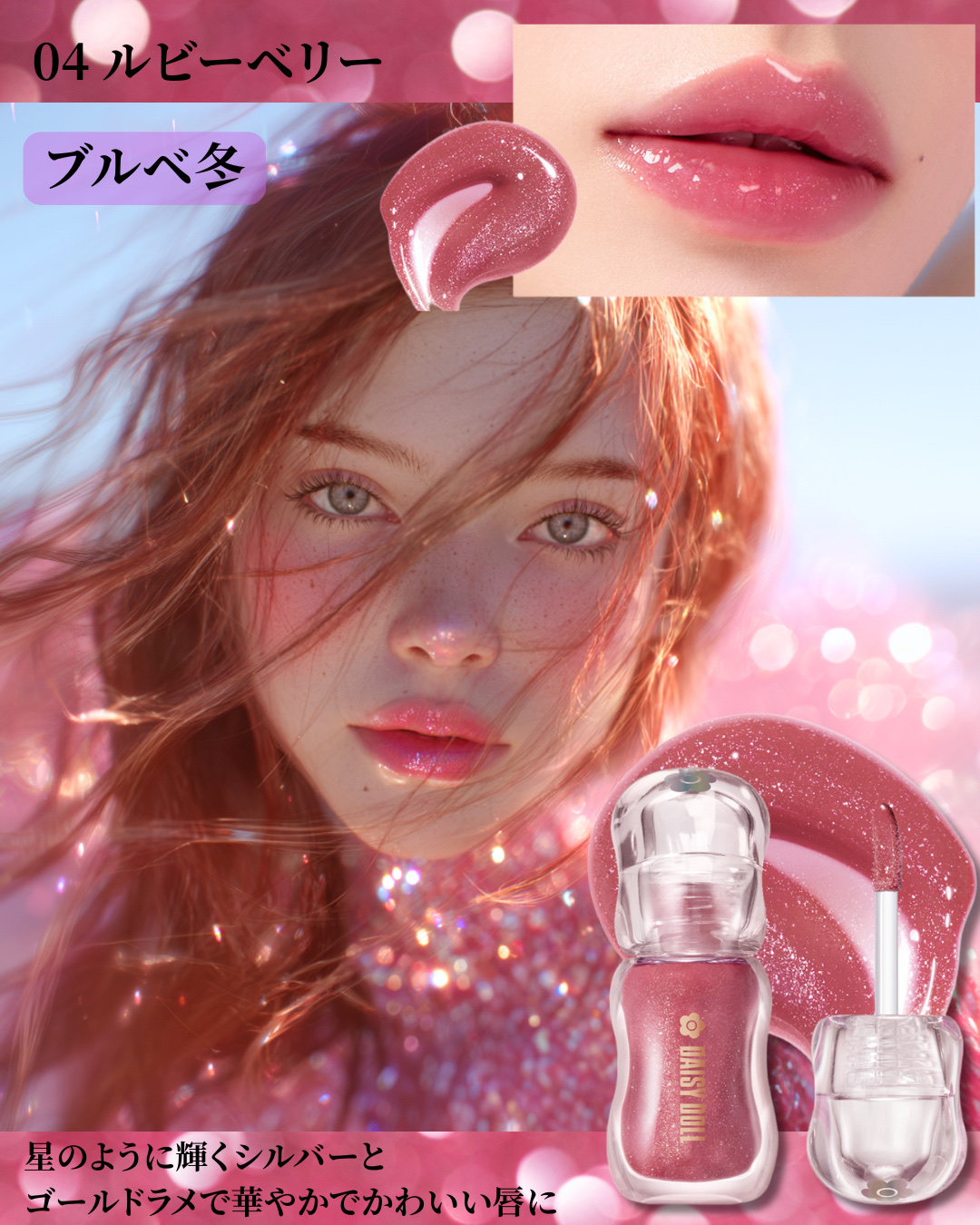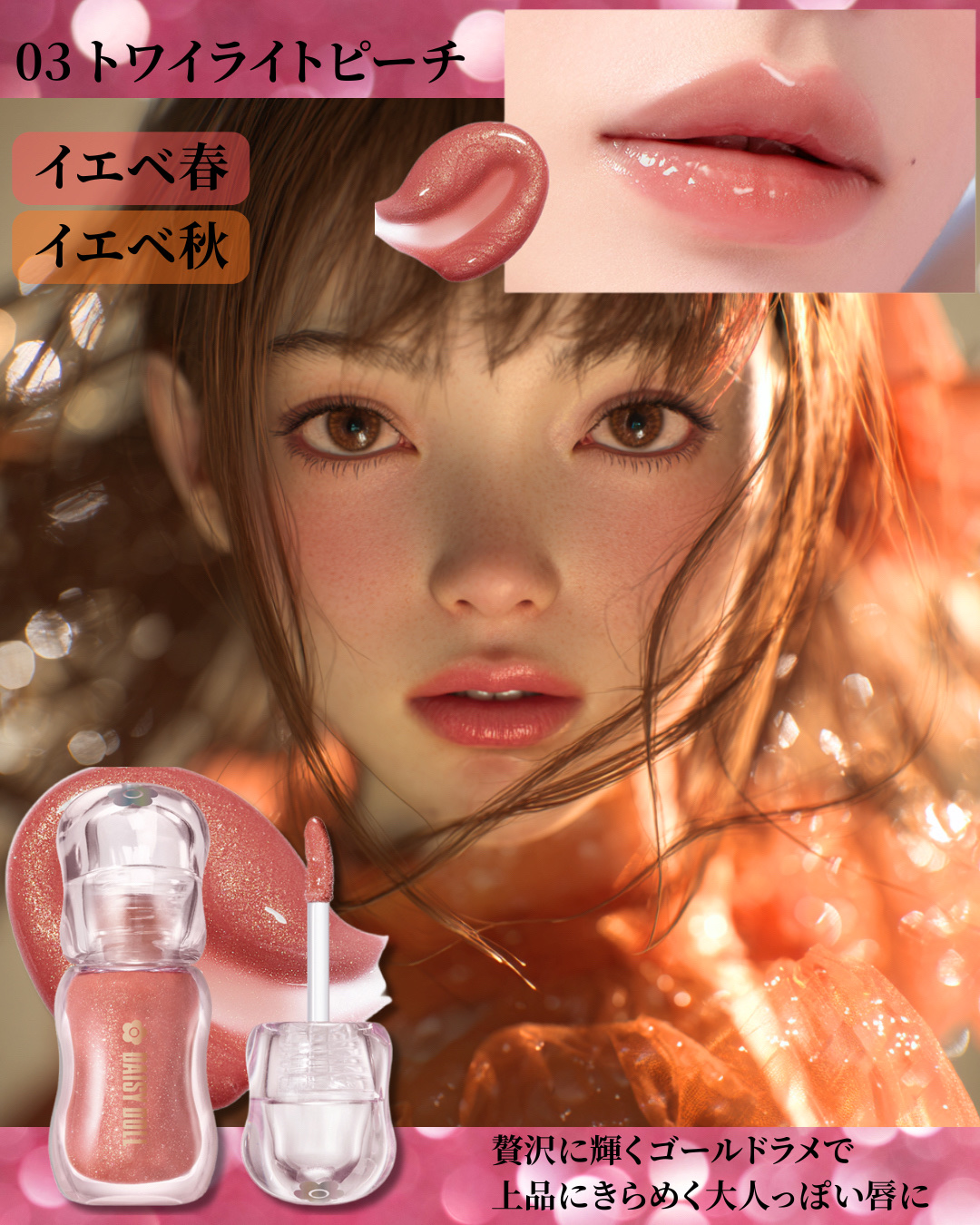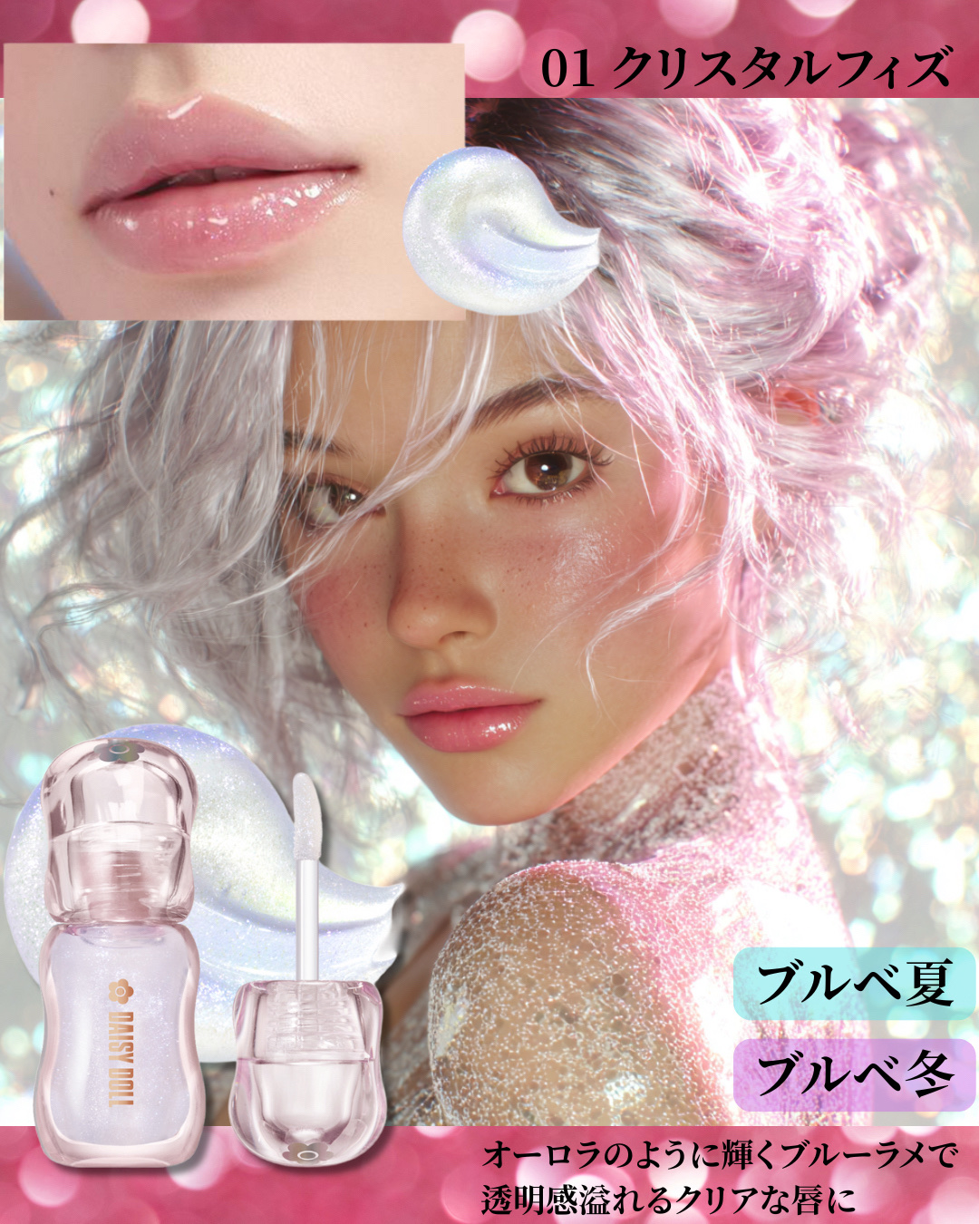- デイジードールから、ジュエリーのようなきらめきと、シロップのようなツヤ感を与える、まるでパックのようなリップグロスが登場! ジュエリーのような輝きを放つたっぷりのラメと、シロップのようなとろけるツヤのベールが重なりあう、リップケア発想のグロスです。 「ラメ × ツヤ × ニュアンスカラー」のトレンド感あふれる絶妙な4色展開でぷるんとツヤめく理想の唇が長時間続きます。