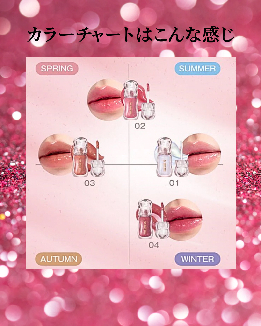 透明感があり、そこまで発色しませんがさりげなくて可愛いです😍ムチっとした柔らかいテクスチャで時間が経っても保湿力がありました✨ラメも細かいので、ラメ感というより艶出しです。チップも液も柔らかめなので、塗り心地はフニャリって感じです😆...