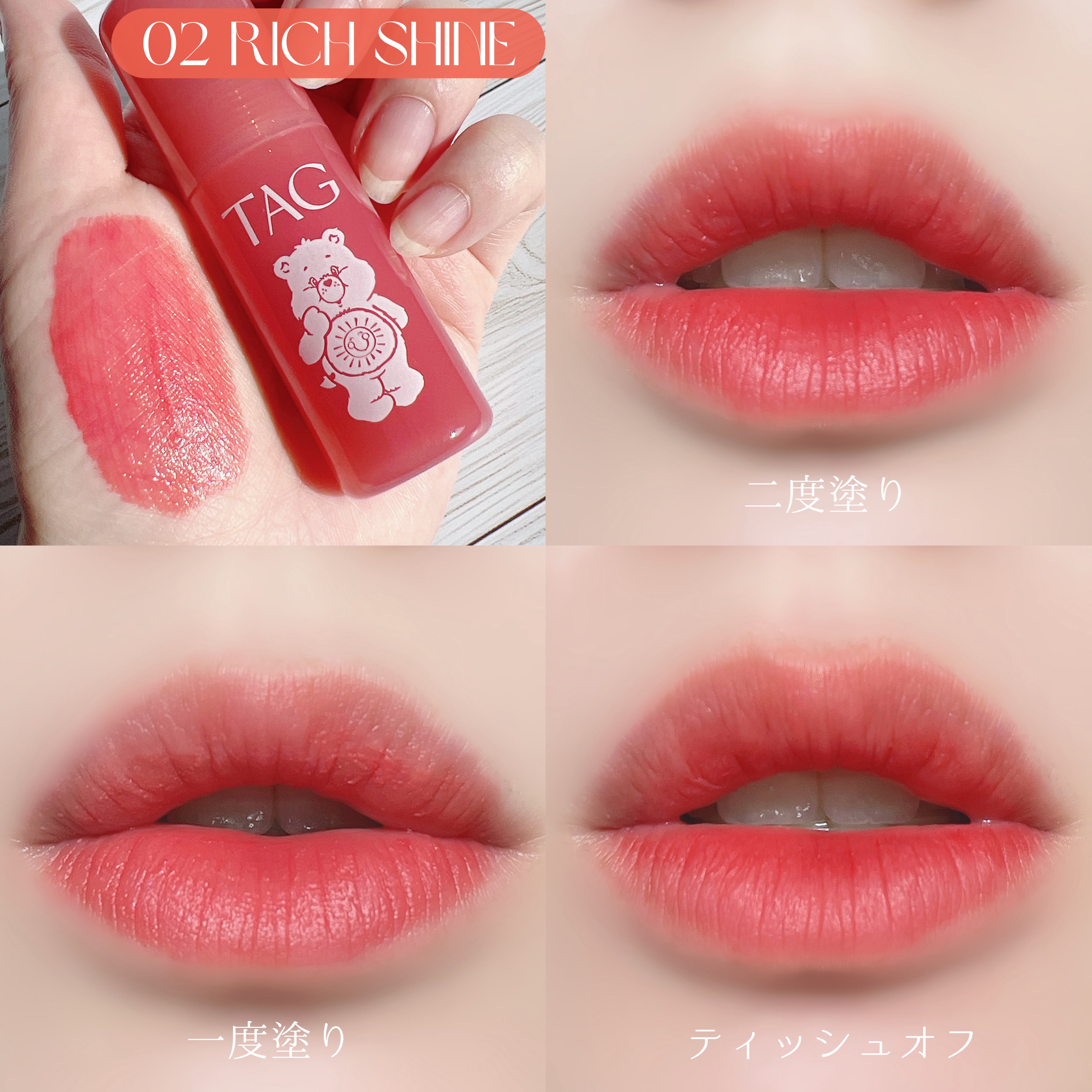 🌈💖ついに登場💖🌈発売前からバズってたケアベアコラボが日本でついに発売開始!TAGWATERFITJELLYTINT02RICHSHINE水みたいな軽い付け心地なのに色落ちしずらいからストレスフリーで楽しめるの🥰✨ひと塗りで高発色だから長時間...