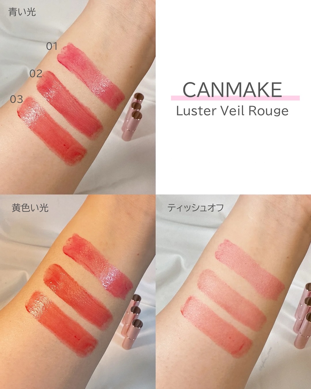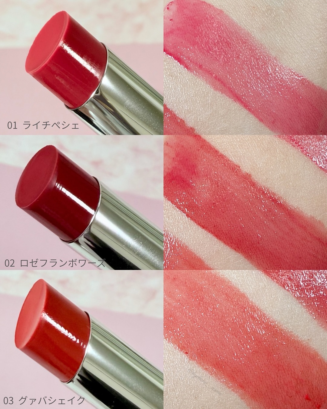 - <01 ライチペシェ> アルキル(C20ー24)ジメチコン、水添ポリイソブテン、ペンタイソステアリン酸ジペンタエリスリチル、オクチルドデカノール、トリ(カプリル酸/カプリン酸)グリセリル、ダイマージリノール酸(フィトステリル/イソステアリル/セチル/ステアリル/ベヘニル)、ラウロイルグルタミン酸ジ(フィトステリル/オクチルドデシル)、パラフィン、ラウロイルグルタミン酸ジ(オクチルドデシル/フィトステリル/ベヘニル)、合成ワックス、イソノナン酸イソトリデシル、水添ココグリセリル、リンゴ酸ジイソステアリル、酸化チタン、マカデミア種子油、ツボクサエキス、キトサン、トリ脂肪酸(C10ー18)グリセリル、合成フルオロフロゴパイト、トリイソステアリン酸ポリグリセリルー2、マイクロクリスタリンワックス、(エチレン/プロピレン)コポリマー、ジイソステアリン酸ポリグリセリルー2、ステアラルコニウムヘクトライト、炭酸プロピレン、トコフェロール、水、アラントイン、ナイアシンアミド、グリセリン、BG、水添レシチン、1,2ーヘキサンジオール、アブラナステロ―ルズ、レチノール、コレステロール、ラウリン酸ポリグリセリルー10、セラミドNP、ステアリン酸水酸化(Al/Mg)、テトラ(ジーt-ブチルヒドロキシヒドロケイヒ酸)ペンタエリスリチル、セチルリン酸K、クエン酸トリス(テトラメチルヒドロキシピペリジノール)、酸化鉄、赤104(1)、赤202、赤227、青1、黄4 <02 ロゼフランボワーズ> アルキル(C20ー24)ジメチコン、水添ポリイソブテン、ペンタイソステアリン酸ジペンタエリスリチル、オクチルドデカノール、トリ(カプリル酸/カプリン酸)グリセリル、ダイマージリノール酸(フィトステリル/イソステアリル/セチル/ステアリル/ベヘニル)、ラウロイルグルタミン酸ジ(フィトステリル/オクチルドデシル)、パラフィン、ラウロイルグルタミン酸ジ(オクチルドデシル/フィトステリル/ベヘニル)、合成ワックス、イソノナン酸イソトリデシル、水添ココグリセリル、リンゴ酸ジイソステアリル、酸化チタン、マカデミア種子油、ツボクサエキス、キトサン、トリ脂肪酸(C10ー18)グリセリル、合成フルオロフロゴパイト、トリイソステアリン酸ポリグリセリルー2、マイクロクリスタリンワックス、(エチレン/プロピレン)コポリマー、ジイソステアリン酸ポリグリセリルー2、ステアラルコニウムヘクトライト、炭酸プロピレン、トコフェロール、水、アラントイン、ナイアシンアミド、グリセリン、BG、水添レシチン、1,2ーヘキサンジオール、アブラナステロ―ルズ、レチノール、コレステロール、ラウリン酸ポリグリセリルー10、セラミドNP、ステアリン酸水酸化(Al/Mg)、テトラ(ジーt-ブチルヒドロキシヒドロケイヒ酸)ペンタエリスリチル、セチルリン酸K、クエン酸トリス(テトラメチルヒドロキシピペリジノール)、酸化鉄、赤202、青1、黄5 <03 グァバシェイク> アルキル(C20ー24)ジメチコン、水添ポリイソブテン、ペンタイソステアリン酸ジペンタエリスリチル、オクチルドデカノール、トリ(カプリル酸/カプリン酸)グリセリル、ダイマージリノール酸(フィトステリル/イソステアリル/セチル/ステアリル/ベヘニル)、ラウロイルグルタミン酸ジ(フィトステリル/オクチルドデシル)、パラフィン、ラウロイルグルタミン酸ジ(オクチルドデシル/フィトステリル/ベヘニル)、合成ワックス、イソノナン酸イソトリデシル、水添ココグリセリル、リンゴ酸ジイソステアリル、トリイソステアリン酸ポリグリセリルー2、酸化チタン、マカデミア種子油、ツボクサエキス、キトサン、トリ脂肪酸(C10ー18)グリセリル、合成フルオロフロゴパイト、マイクロクリスタリンワックス、(エチレン/プロピレン)コポリマー、ジイソステアリン酸ポリグリセリルー2、ステアラルコニウムヘクトライト、炭酸プロピレン、トコフェロール、水、アラントイン、ナイアシンアミド、グリセリン、BG、水添レシチン、1,2ーヘキサンジオール、アブラナステロ―ルズ、レチノール、コレステロール、ラウリン酸ポリグリセリルー10、セラミドNP、ステアリン酸水酸化(Al/Mg)、テトラ(ジーt-ブチルヒドロキシヒドロケイヒ酸)ペンタエリスリチル、セチルリン酸K、クエン酸トリス(テトラメチルヒドロキシピペリジノール)、酸化鉄、赤104(1)、赤201、赤202、黄4、黄5