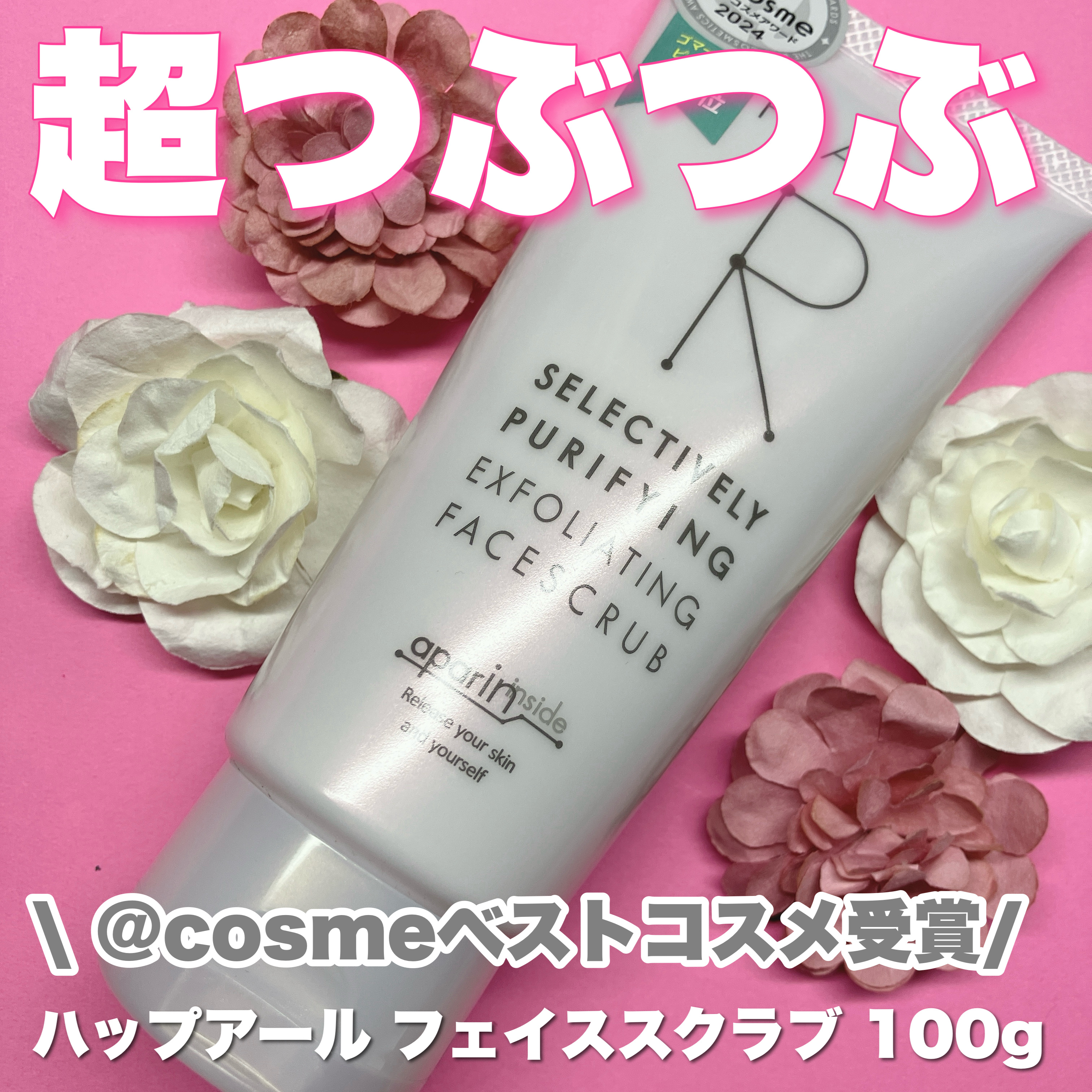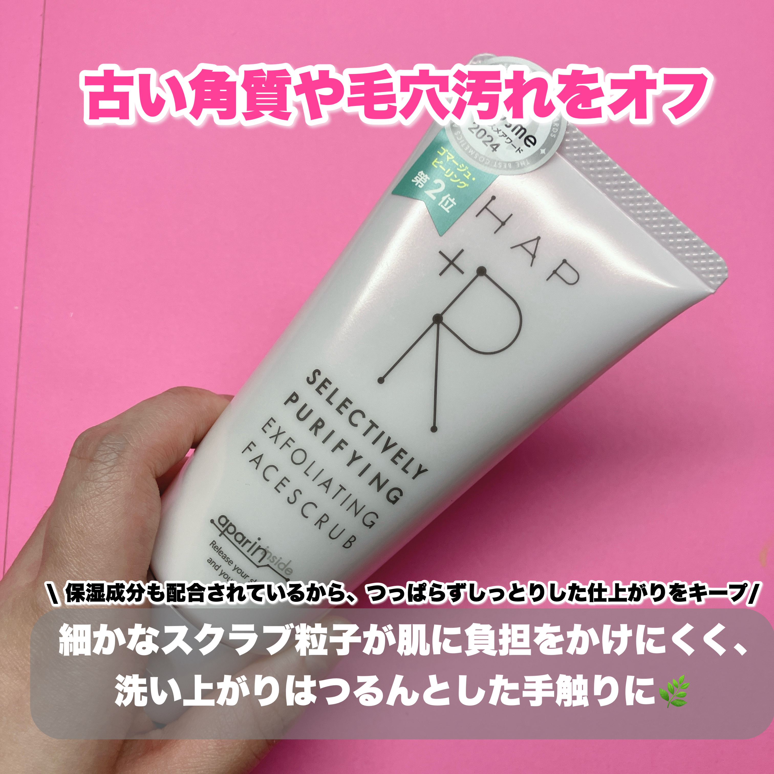 アパタイトをスクラブ粒子化し、たっぷりと配合したフェイススクラブ! つぶつぶのアパタイトが、酸化した皮脂とくすみの原因となる古い角質、毛穴の汚れを吸着してくれます。 @cosmeベストコスメアワード2024ねんベストゴマージュ・ピーリング部門第2位を獲得されたそうです!