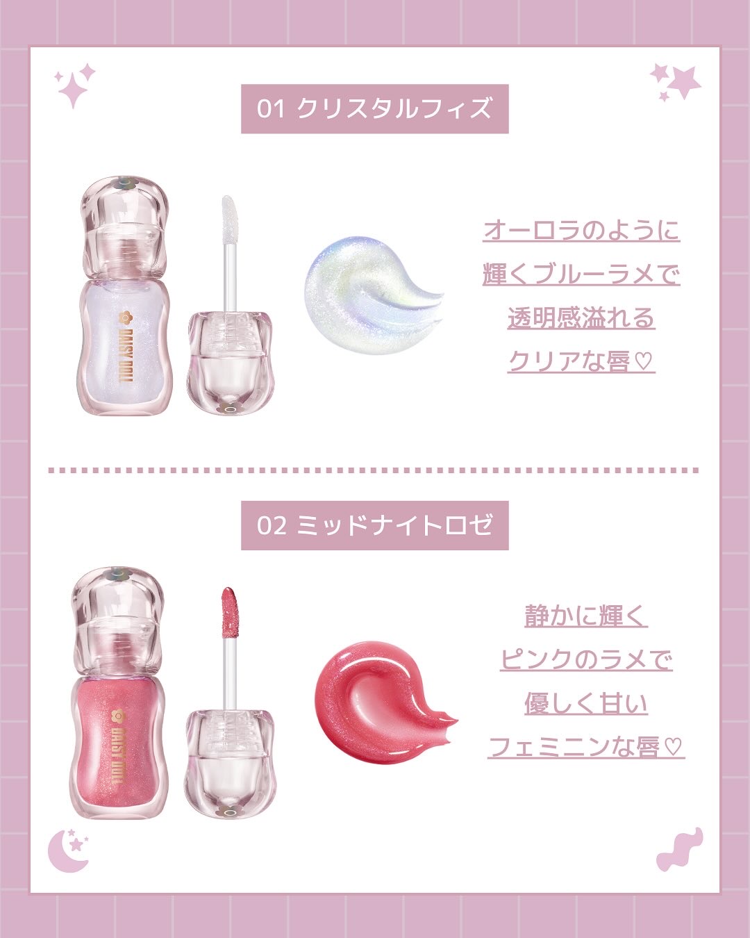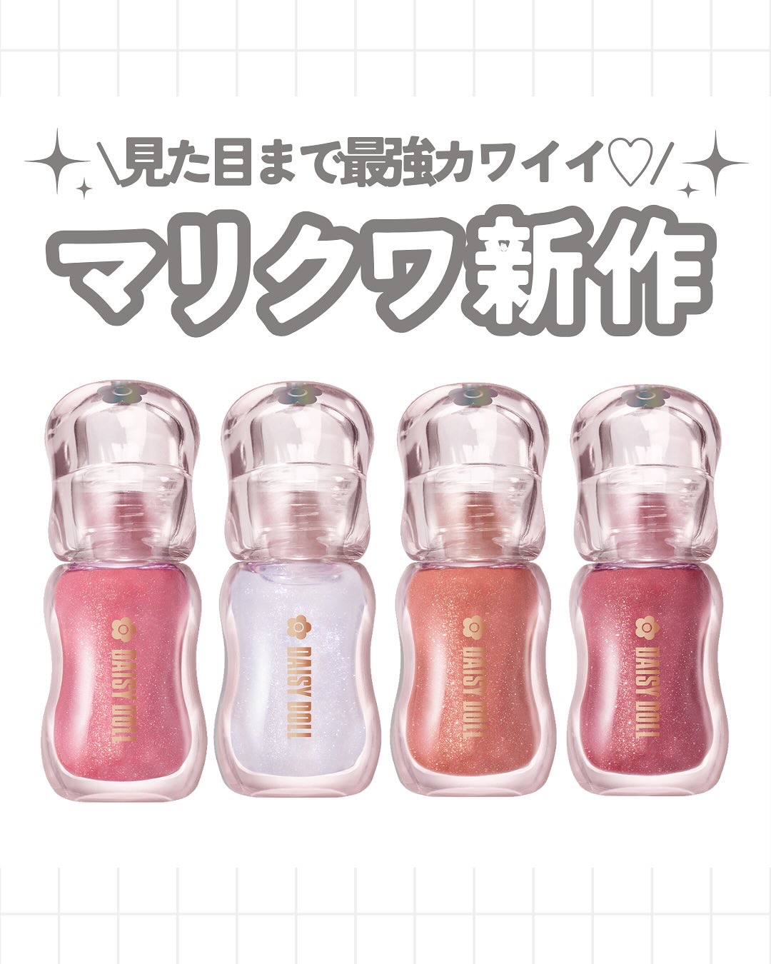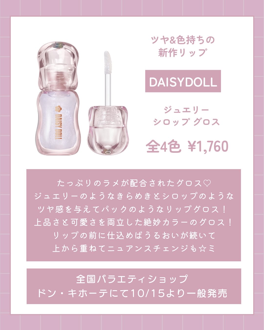 - デイジードールから、ジュエリーのようなきらめきと、シロップのようなツヤ感を与える、まるでパックのようなリップグロスが登場! ジュエリーのような輝きを放つたっぷりのラメと、シロップのようなとろけるツヤのベールが重なりあう、リップケア発想のグロスです。 「ラメ × ツヤ × ニュアンスカラー」のトレンド感あふれる絶妙な4色展開でぷるんとツヤめく理想の唇が長時間続きます。