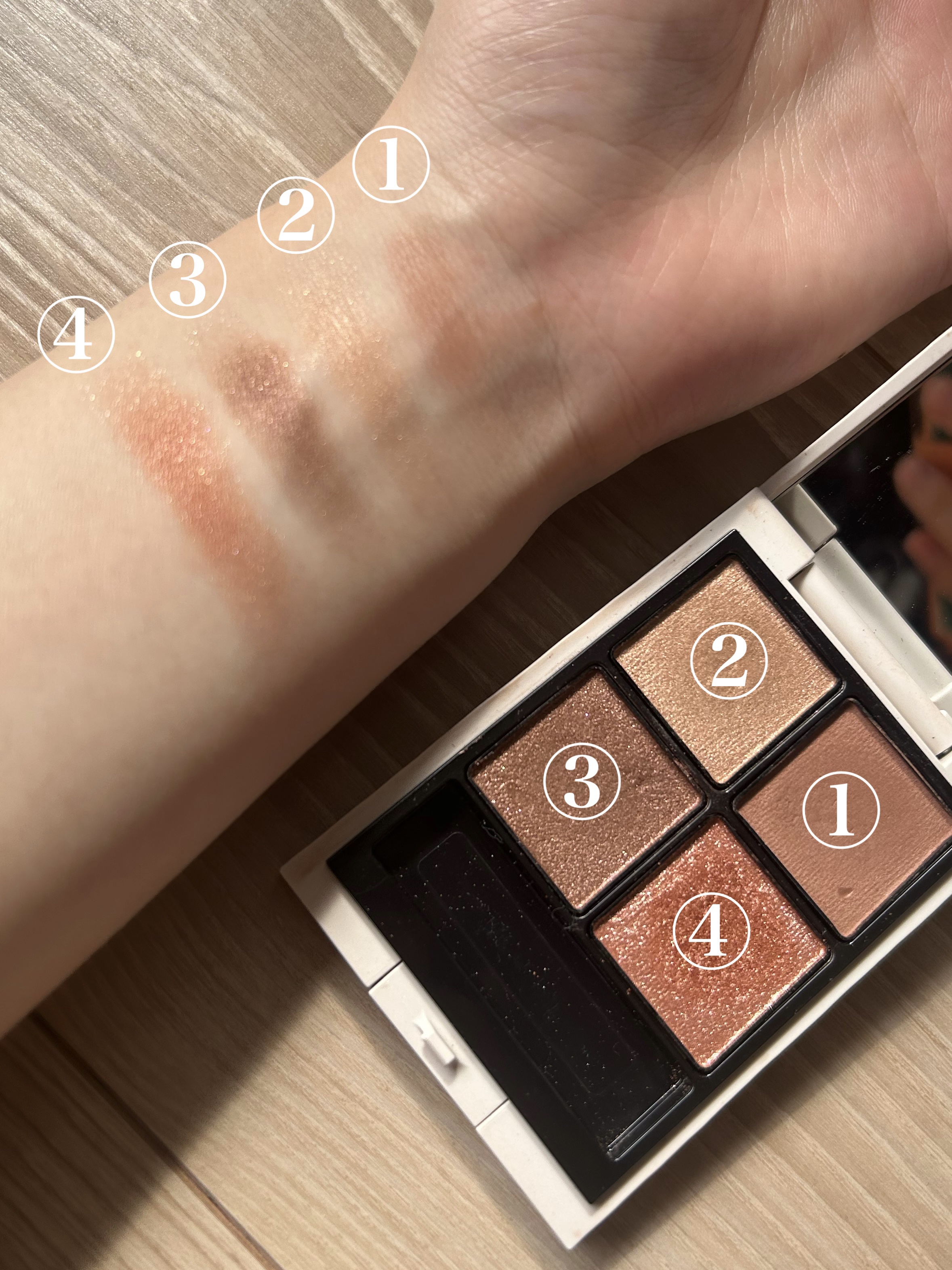 まず、左上の色がめちゃくちゃ可愛いの🥹 たくさんの色が混ざってるんだけど、つけた感じはゴールドっぽい色になるよ! 上まぶたと目頭に載せたら暗闇でもキラキラ光るから、イルミネーションにも負けない目元ができちゃう🫶