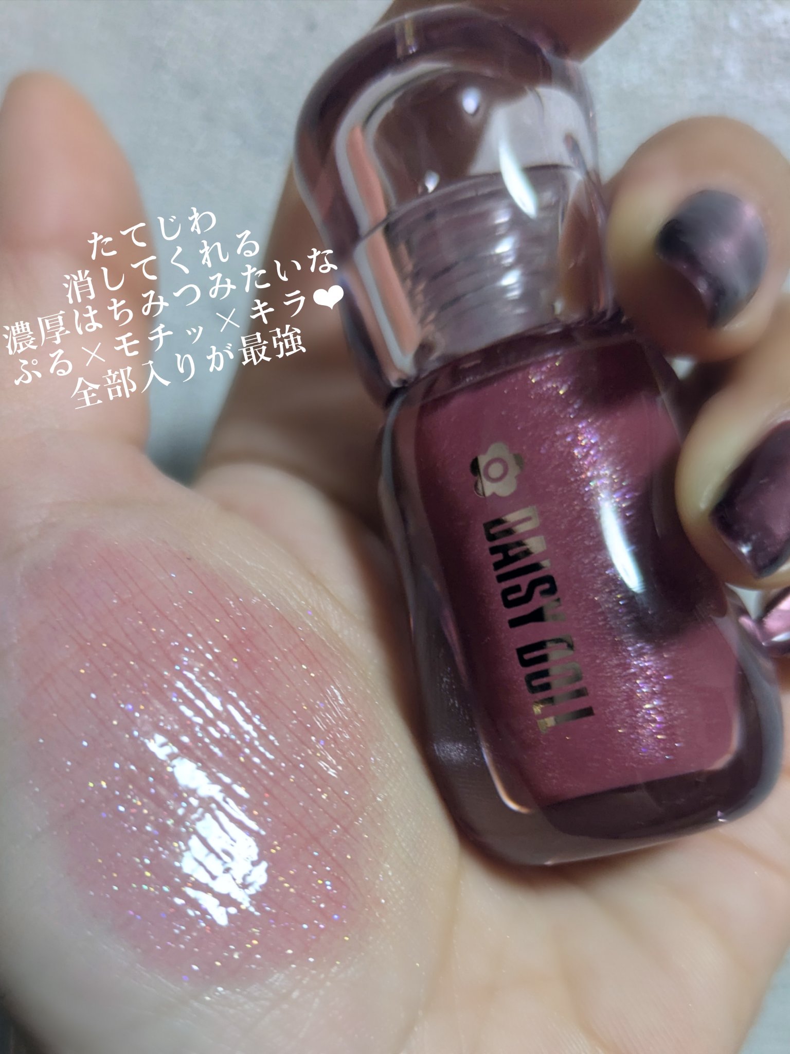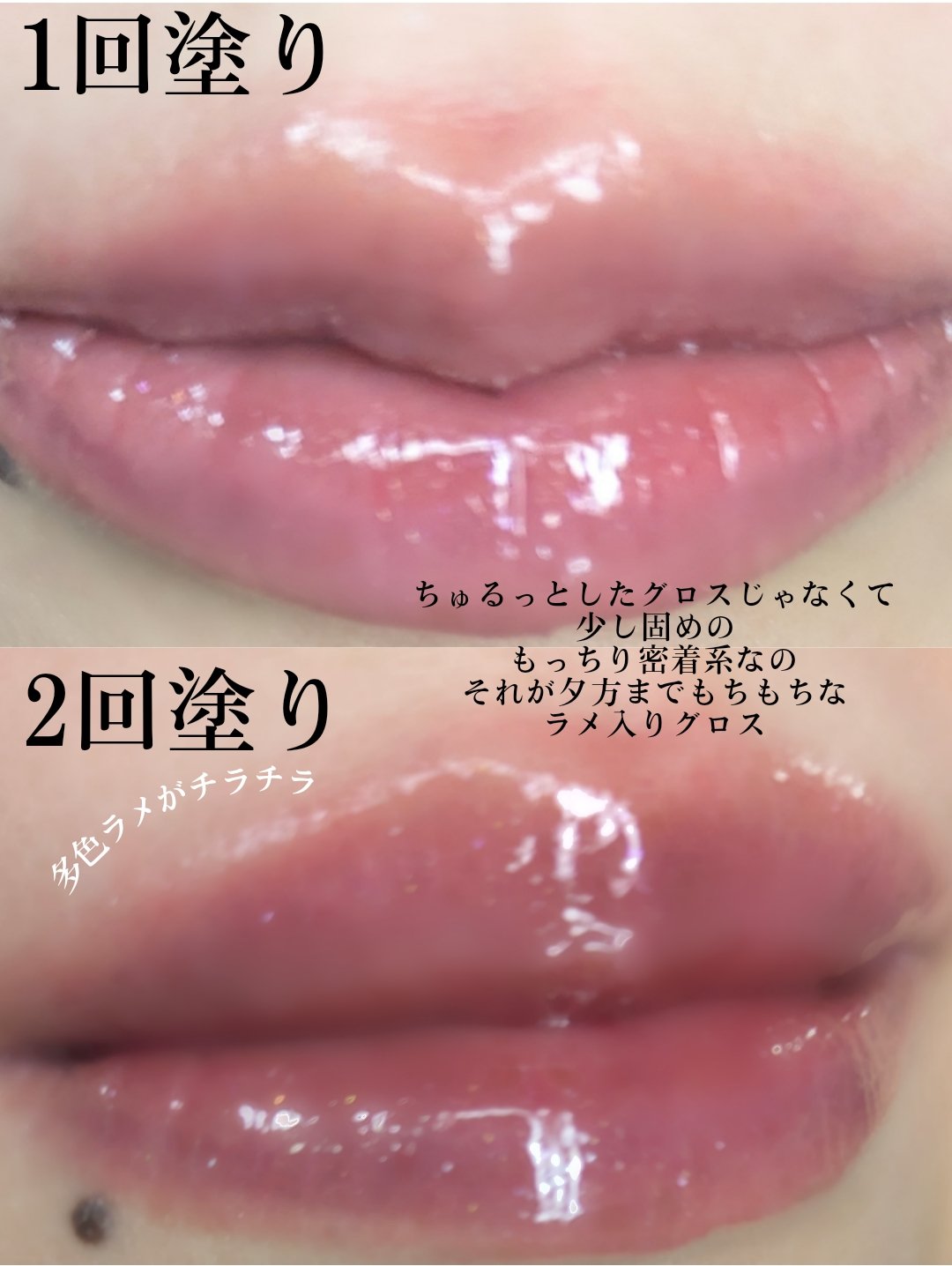 透明感があり、そこまで発色しませんがさりげなくて可愛いです😍ムチっとした柔らかいテクスチャで時間が経っても保湿力がありました✨ラメも細かいので、ラメ感というより艶出しです。チップも液も柔らかめなので、塗り心地はフニャリって感じです😆...