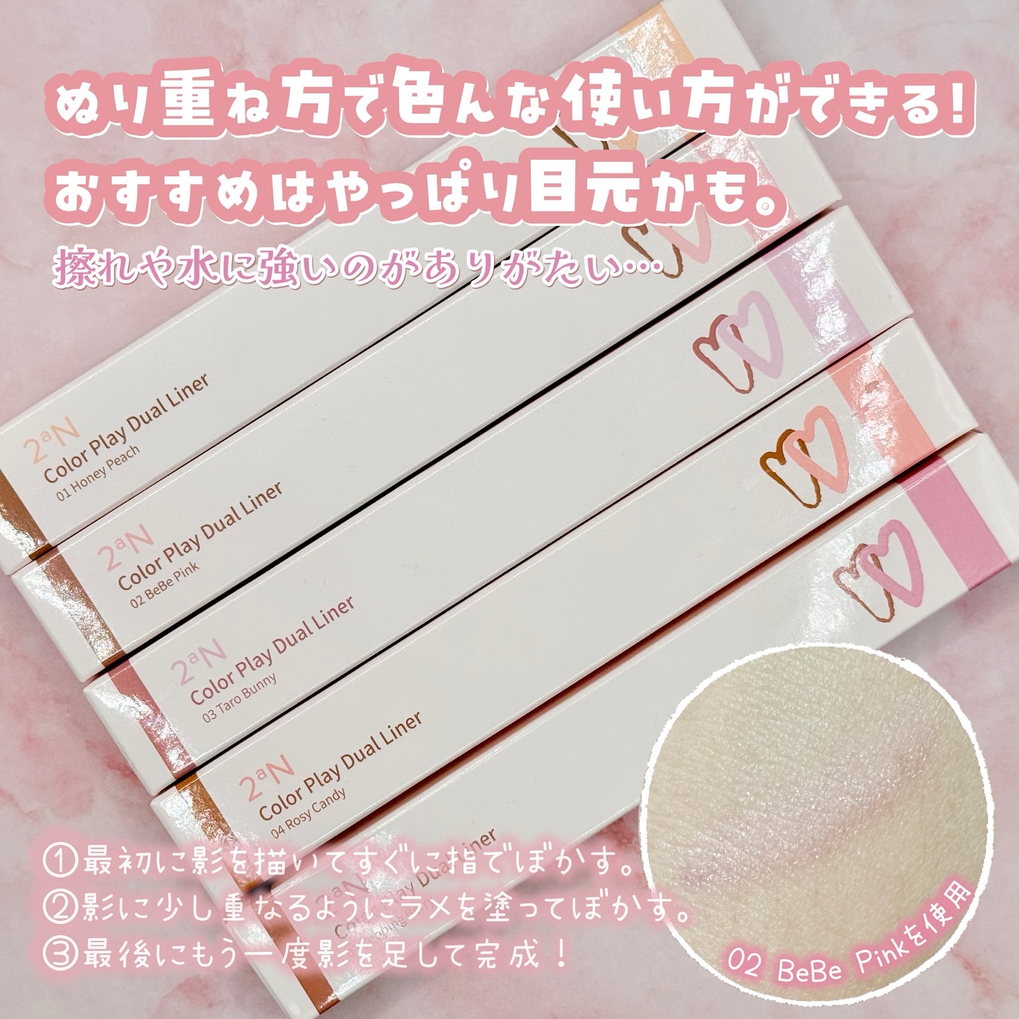 滲まんし、さっと引くだけだし🥺💓好⋆⋆2aNカラープレイデュアルライナー¥1,430(税込)*Qoo10公式ショップ価格・9/29現在⋆⋆求心顔・面長の私の使用方法も載せてみた〜!!カラー系涙袋が好きな子もハイライト系涙袋が好きな子も好きな色...