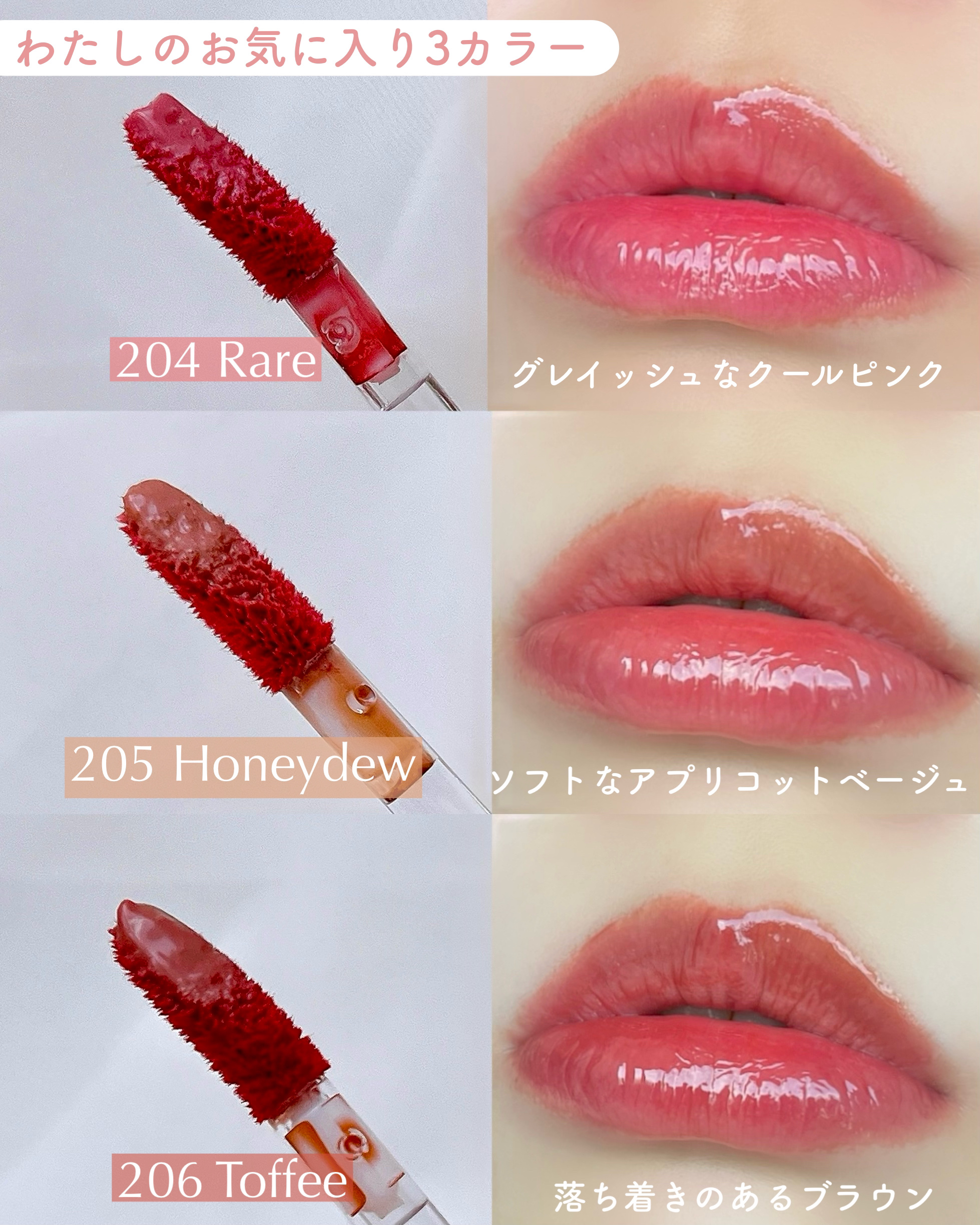 - <201 フェアリー> ダイマージリノール酸ジイソステアリル、ジフェニルシロキシフェニルトリメチコン、ビスジグリセリルポリアシルアジペート-2、水、ジフェニルジメチコン、水添ポリイソブテン、セチルPEG/PPG-10/1ジメチコン、ポリソルベート60、ペンチレングリコール、グリセリン、イソステアリン酸ポリグリセリル-4、フェノキシエタノール、1,2-ヘキサンジオール、セテアレス-20、酸化チタン (CI 77891)、(アクリル酸ヒドロキシエチル/アクリロイルジメチルタウリンNa)コポリマー、ステビオシド、スクワラン、香料、ジラウラミドグルタミドリシンNa、エチルヘキシルグリセリン、エチレンジアミンジコハク酸3Na、赤色227号 (CI 17200)、水酸化Al、黄色5号 (CI 15985)、ポリアクリル酸アンモニウム、イソステアリン酸ソルビタン、黄色4号 (CI 19140)、BG、赤色223号 (CI 45410)、青色1号 (CI 42090)、アラントイン、パンテノール、ツボクサエキス、ヒアルロン酸、加水分解ヒアルロン酸、ヒアルロン酸Na <203 バブリー> ダイマージリノール酸ジイソステアリル、ジフェニルシロキシフェニルトリメチコン、ビスジグリセリルポリアシルアジペート-2、水、ジフェニルジメチコン、水添ポリイソブテン、セチルPEG/PPG-10/1ジメチコン、ポリソルベート60、ペンチレングリコール、グリセリン、イソステアリン酸ポリグリセリル-4、フェノキシエタノール、1,2-ヘキサンジオール、セテアレス-20、(アクリル酸ヒドロキシエチル/アクリロイルジメチルタウリンNa)コポリマー、ステビオシド、酸化チタン (CI 77891)、スクワラン、香料、ジラウラミドグルタミドリシンNa、エチルヘキシルグリセリン、赤色227号 (CI 17200)、エチレンジアミンジコハク酸3Na、黄色5号 (CI 15985)、イソステアリン酸ソルビタン、水酸化Al、ポリアクリル酸アンモニウム、黄色4号 (CI 19140)、BG、青色1号 (CI 42090)、アラントイン、パンテノール、ツボクサエキス、ヒアルロン酸、加水分解ヒアルロン酸、ヒアルロン酸Na <204 レア> ダイマージリノール酸ジイソステアリル、ジフェニルシロキシフェニルトリメチコン、ビスジグリセリルポリアシルアジペート-2、水、ジフェニルジメチコン、水添ポリイソブテン、セチルPEG/PPG-10/1ジメチコン、ポリソルベート60、ペンチレングリコール、グリセリン、イソステアリン酸ポリグリセリル-4、フェノキシエタノール、1,2-ヘキサンジオール、セテアレス-20、(アクリル酸ヒドロキシエチル/アクリロイルジメチルタウリンNa)コポリマー、酸化チタン (CI 77891)、ステビオシド、スクワラン、香料、ジラウラミドグルタミドリシンNa、エチルヘキシルグリセリン、赤色227号 (CI 17200)、黄色5号 (CI 15985)、エチレンジアミンジコハク酸3Na、イソステアリン酸ソルビタン、水酸化Al、ポリアクリル酸アンモニウム、黄色4号 (CI 19140)、青色1号 (CI 42090)、BG、アラントイン、パンテノール、ツボクサエキス、ヒアルロン酸、加水分解ヒアルロン酸、ヒアルロン酸Na <205 ハニーデュー> ダイマージリノール酸ジイソステアリル、ジフェニルシロキシフェニルトリメチコン、ビスジグリセリルポリアシルアジペート-2、水、ジフェニルジメチコン、水添ポリイソブテン、セチルPEG/PPG-10/1ジメチコン、ポリソルベート60、ペンチレングリコール、グリセリン、イソステアリン酸ポリグリセリル-4、フェノキシエタノール、1,2-ヘキサンジオール、セテアレス-20、(アクリル酸ヒドロキシエチル/アクリロイルジメチルタウリンNa)コポリマー、酸化チタン (CI 77891)、ステビオシド、スクワラン、香料、ジラウラミドグルタミドリシンNa、エチルヘキシルグリセリン、赤色227号 (CI 17200)、黄色5号 (CI 15985)、エチレンジアミンジコハク酸3Na、イソステアリン酸ソルビタン、水酸化Al、ポリアクリル酸アンモニウム、黄色4号 (CI 19140)、青色1号 (CI 42090)、BG、アラントイン、パンテノール、ツボクサエキス、ヒアルロン酸、加水分解ヒアルロン酸、ヒアルロン酸Na <206 トフィー> ダイマージリノール酸ジイソステアリル、ジフェニルシロキシフェニルトリメチコン、ビスジグリセリルポリアシルアジペート-2、水、ジフェニルジメチコン、水添ポリイソブテン、セチルPEG/PPG-10/1ジメチコン、ポリソルベート60、ペンチレングリコール、グリセリン、イソステアリン酸ポリグリセリル-4、フェノキシエタノール、1,2-ヘキサンジオール、セテアレス-20、(アクリル酸ヒドロキシエチル/アクリロイルジメチルタウリンNa)コポリマー、ステビオシド、スクワラン、香料、ジラウラミドグルタミドリシンNa、酸化チタン (CI 77891)、エチルヘキシルグリセリン、黄色5号 (CI 15985)、エチレンジアミンジコハク酸3Na、黄色4号 (CI 19140)、赤色227号 (CI 17200)、イソステアリン酸ソルビタン、赤色223号 (CI 45410)、青色1号 (CI 42090)、水酸化Al、ポリアクリル酸アンモニウム、BG、アラントイン、パンテノール、ツボクサエキス、ヒアルロン酸、加水分解ヒアルロン酸、ヒアルロン酸Na <207 フレイム> ダイマージリノール酸ジイソステアリル、ジフェニルシロ