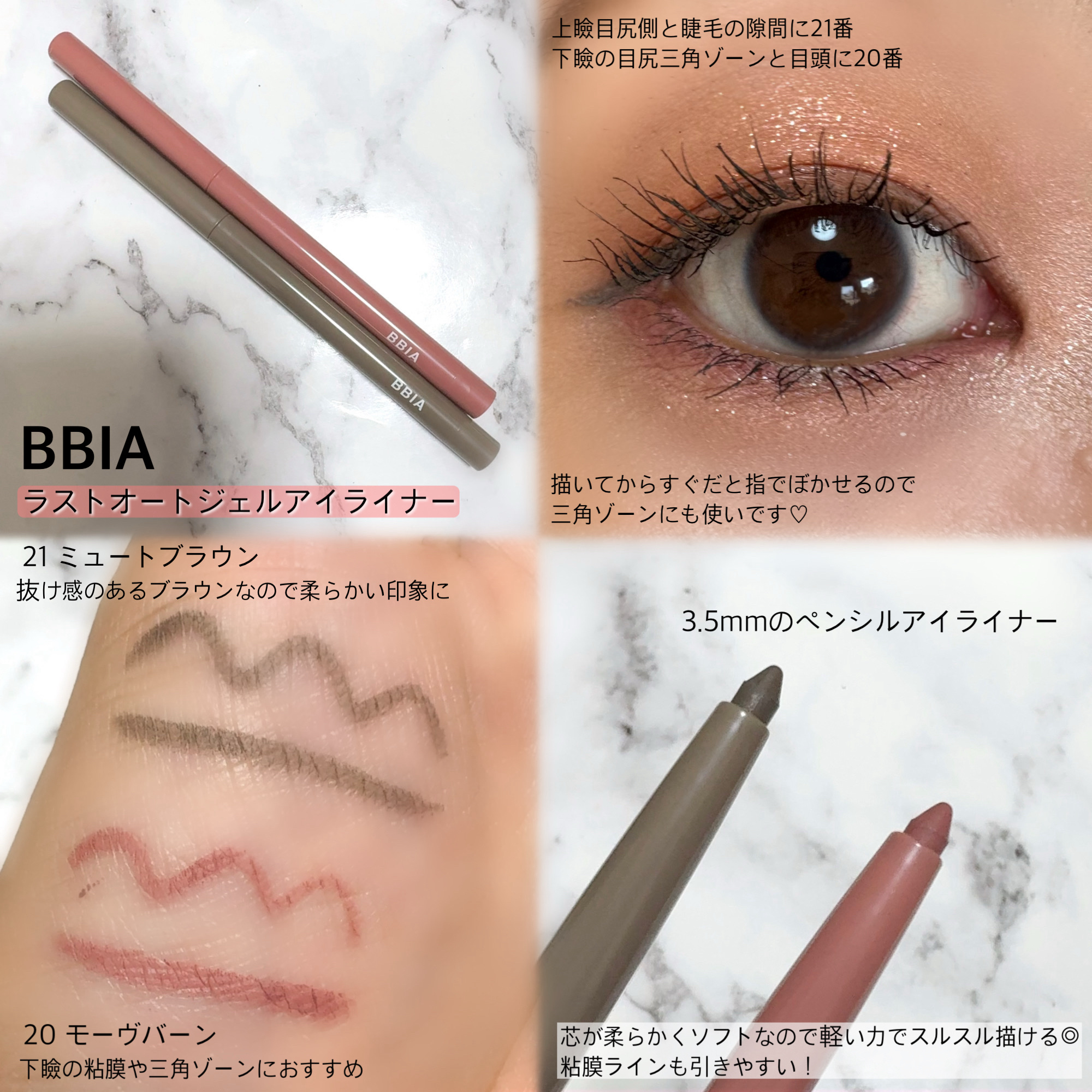 BBIAラストオートジェルアイライナー20モーヴバーン21ミュートブラウンモーヴバーンは、ふんわりぼかば粘膜拡張にピッタリのピンク。ミュートブラウンはきれいな影色で、目尻にいれるのが好き🫶🏻芯が柔らかく描きやすいから、初心者さんでも使いやすい...