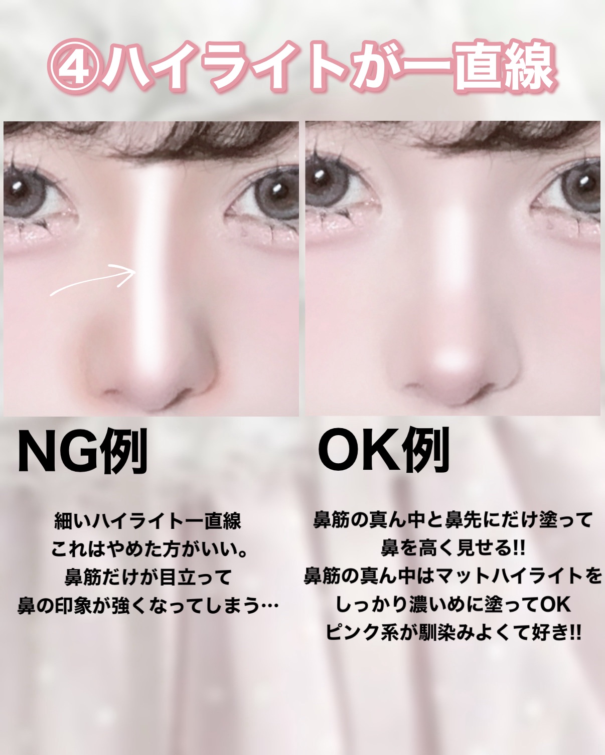小鼻の赤みをカバーしない→どれだけノーズシャドウで鼻の立体感を出せても、小鼻の赤みが残っていると鼻が大きくのっぺり見えてしまいます💦肌の色ムラは垢抜けないメイクの原因にもなります。 赤みカバーに緑のコンシーラーを使う→小鼻の赤みカバーに補色の緑を使うのも効果的ですが、実はイエローも赤みをかなりカバーしてくれます! ツヤ系ハイライトだけを使う→ツヤ系ハイライトを使う前にマットハイライトを仕込んでおくと、もっと自然な立体感を作ることができます。