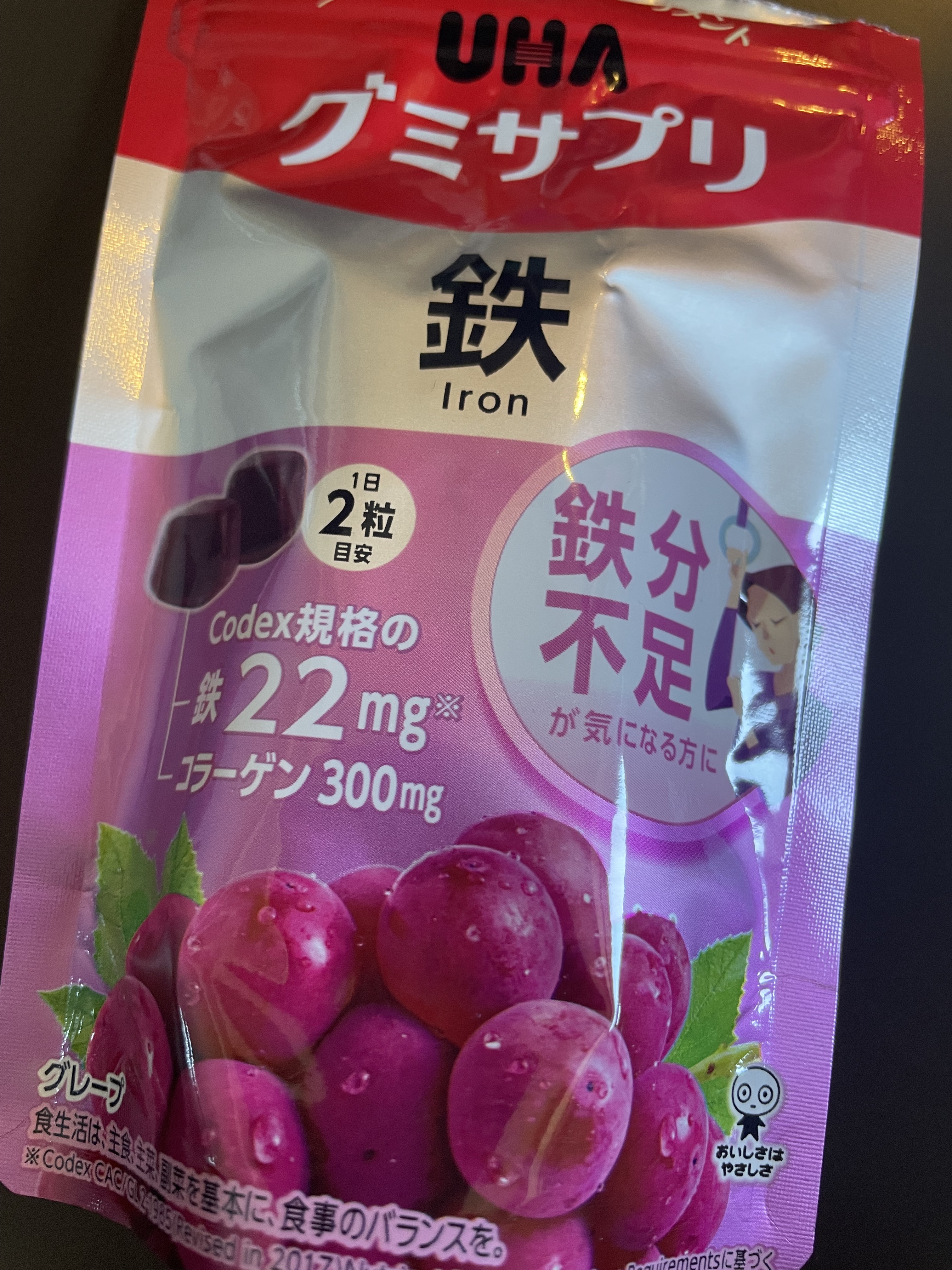 貧血を指摘された私がおやつに取り入れているグミサプリ♪味覚糖UHAグミサプリ鉄1日2粒で鉄22.0mg、コラーゲン300mg摂取可能!鉄サプリって飲みにくかったりするんだけど、グレープ味のグミだから美味しいし食べやすいよ🍇普通のグミより少し硬...