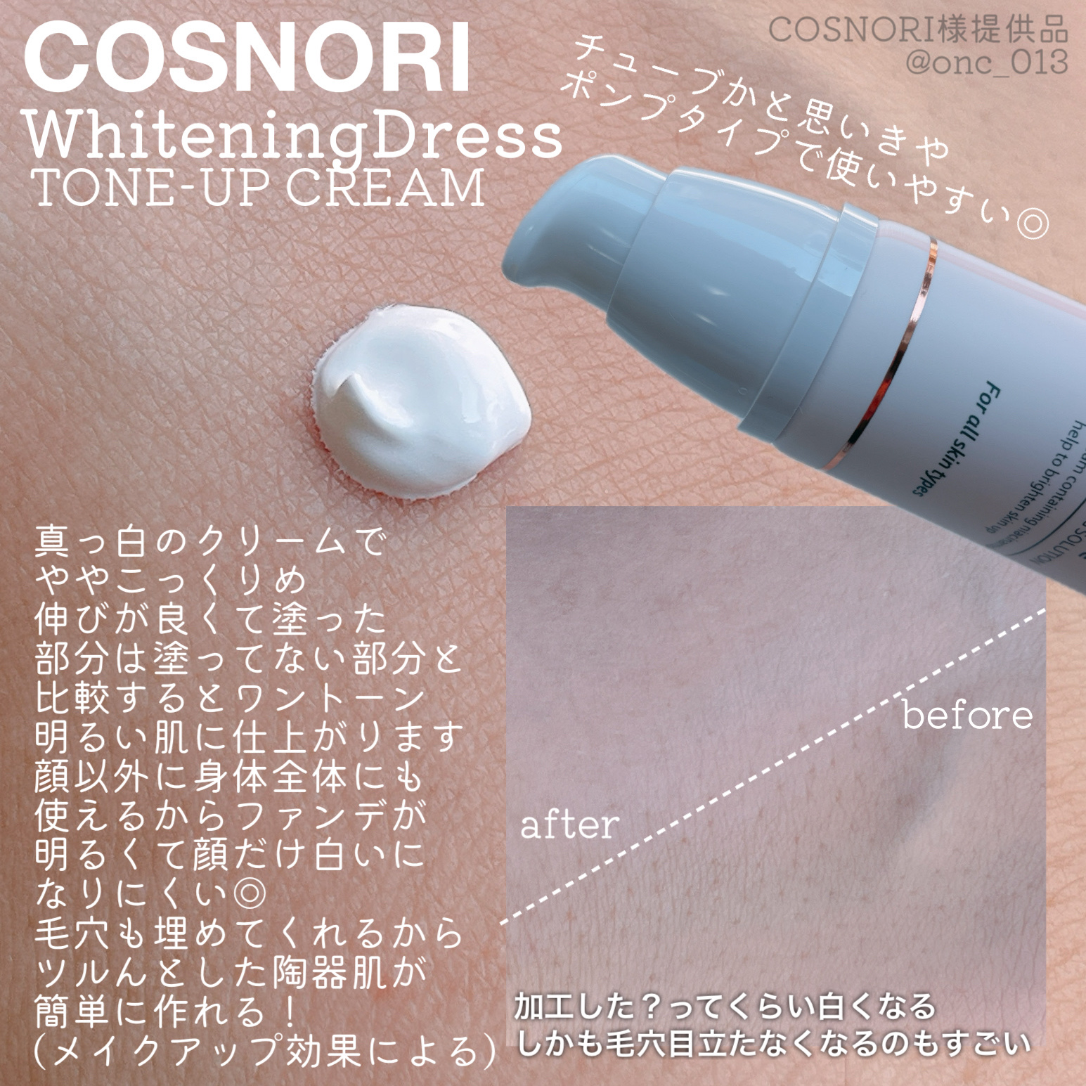 ▪︎COSNORI WHドレストーンアップクリーム ﹏﹏﹏﹏﹏﹏﹏﹏﹏﹏﹏﹏﹏顔だけでなく全身に使えるトーンアップクリーム🩷真っ白でさらっと軽いテクスチャーがナチュラルに肌を明るく見せてくれます。白すぎて浮く感じもなく、自然な仕上がりなのが嬉...