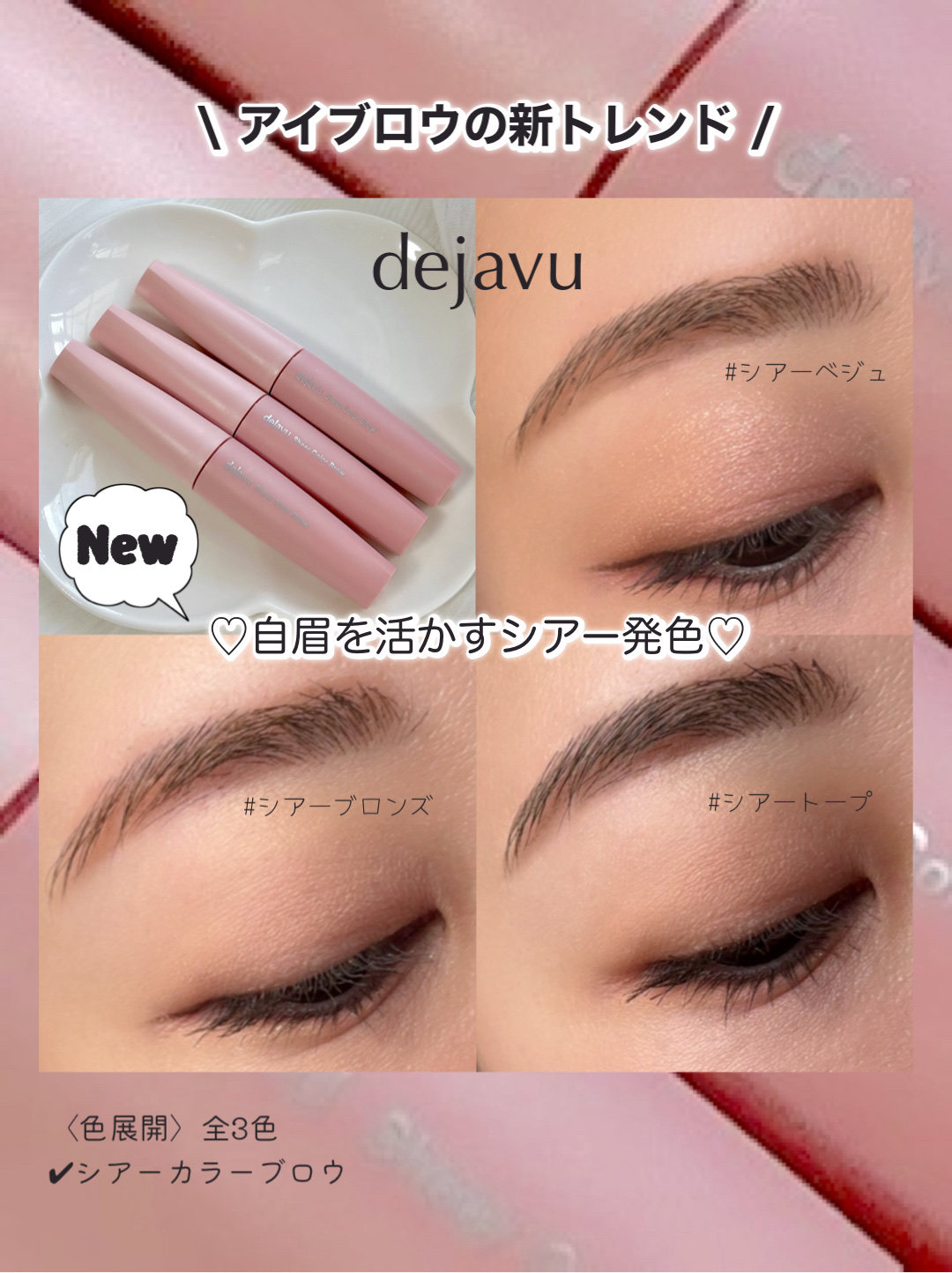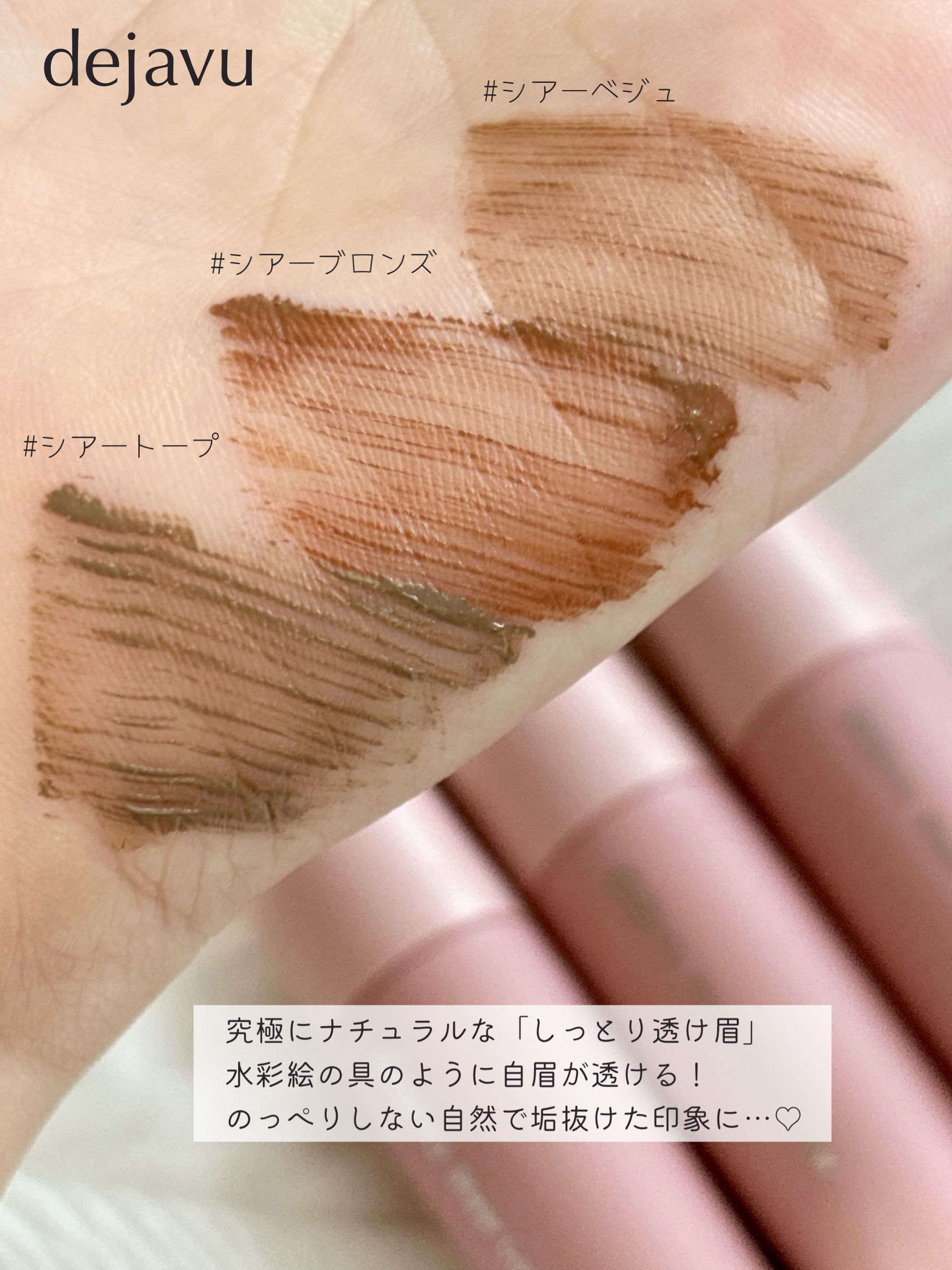 デジャヴュさまからいただきました。シアーカラーブロウ1.シアーベージュ2.シアーブロンズ3.シアートープアイブロウの新トレンド⁉︎自眉を活かすシアーな発色の透け眉マスカラ。自眉が透けるシアーな色づきにすることで、眉を均一に色づけすぎないので、...