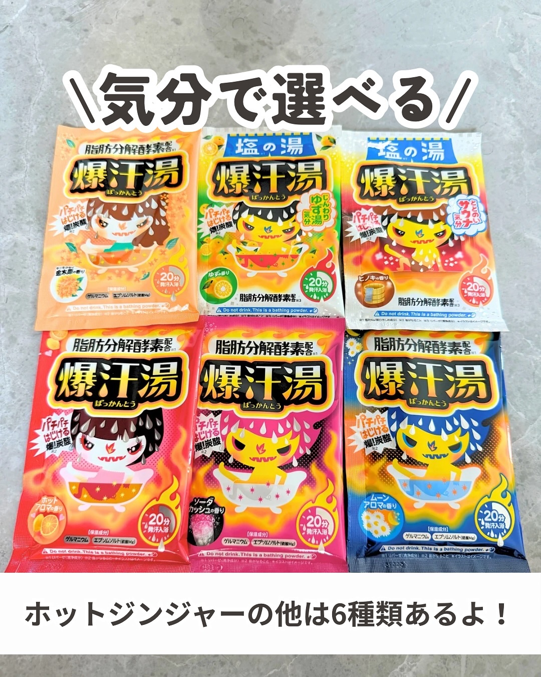 SNSでも話題の爆汗湯♨️入れた直後にパチパチはじける快音浴を楽しめる入浴剤🛁気になってました〜!お湯に入れるとパチパチ炭酸(サウンドシュガー)から炭酸ガスが発生して+重炭酸(炭酸水素Na)が溶け込んだ入浴剤です✨1番人気は赤のホットジンジャ...