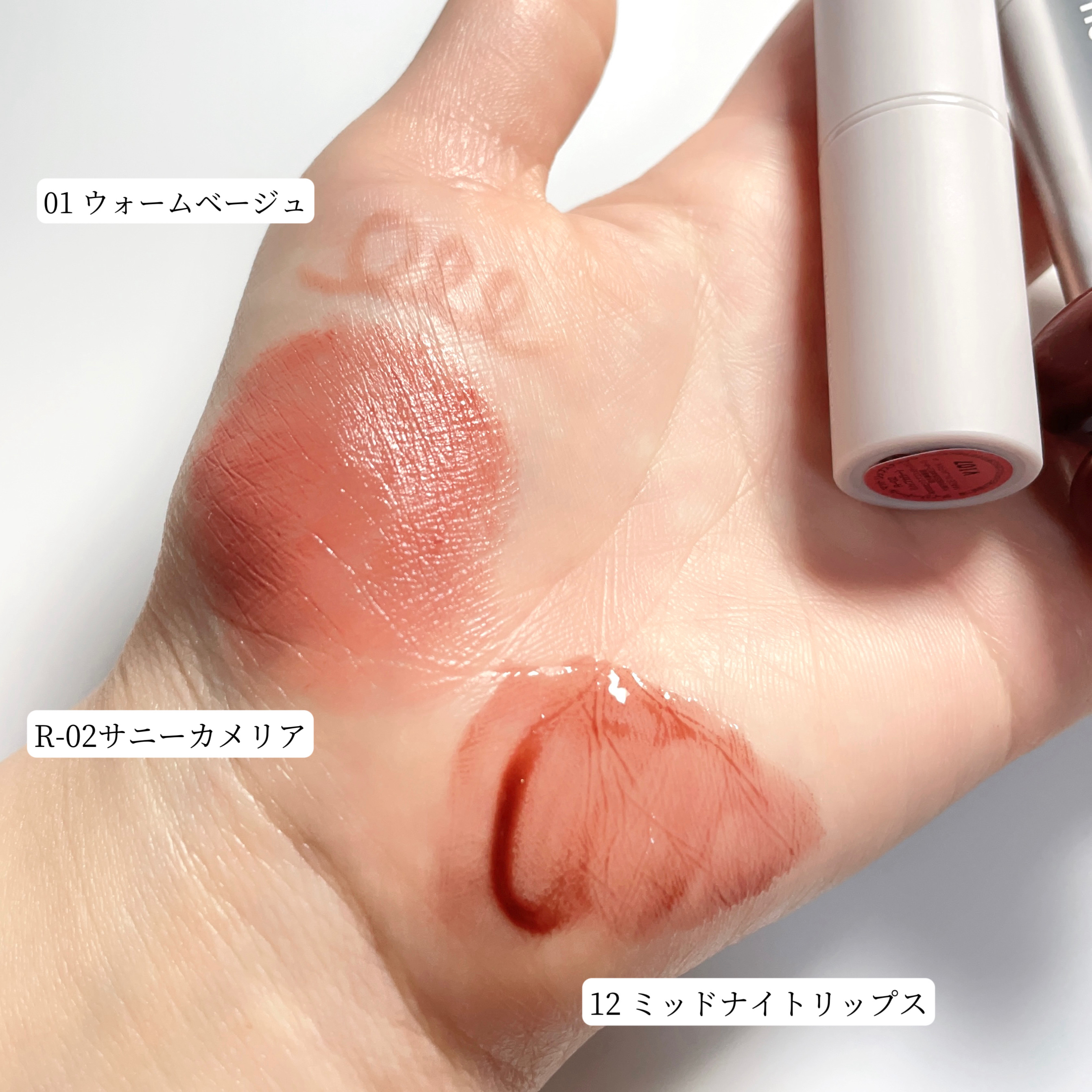 - <01 ウォームベージュ> シクロペンタシロキサン、ジフェニルシロキシフェニルトリメチコン、合成ワックス、脂肪酸(C18-36)グリコール、トリメチルシロキシケイ酸、(アクリレーツ/アクリル酸ステアリル/メタクリル酸ジメチコン)コポリマー、リンゴ酸ジイソステアリル、マイクロクリスタリンワックス、シリル化シリカ、パラフィン、ラウロイルグルタミン酸ジ(フィトステリル/オクチルドデシル)、トコフェロール、スクワラン、マンゴー種子脂、シリカ、ヒアルロン酸Na、酸化鉄、水酸化Al、マイカ、酸化チタン、赤201 <02 クールピンク> シクロペンタシロキサン、ジフェニルシロキシフェニルトリメチコン、合成ワックス、脂肪酸(C18-36)グリコール、トリメチルシロキシケイ酸、(アクリレーツ/アクリル酸ステアリル/メタクリル酸ジメチコン)コポリマー、リンゴ酸ジイソステアリル、マイクロクリスタリンワックス、シリル化シリカ、パラフィン、ラウロイルグルタミン酸ジ(フィトステリル/オクチルドデシル)、トコフェロール、スクワラン、マンゴー種子脂、シリカ、ヒアルロン酸Na、酸化鉄、水酸化Al、マイカ、酸化チタン、カオリン、グンジョウ <03 ソフトコーラル> シクロペンタシロキサン、ジフェニルシロキシフェニルトリメチコン、合成ワックス、脂肪酸(C18-36)グリコール、トリメチルシロキシケイ酸、(アクリレーツ/アクリル酸ステアリル/メタクリル酸ジメチコン)コポリマー、リンゴ酸ジイソステアリル、マイクロクリスタリンワックス、シリル化シリカ、パラフィン、ラウロイルグルタミン酸ジ(フィトステリル/オクチルドデシル)、トコフェロール、マンゴー種子脂、スクワラン、シリカ、ヒアルロン酸Na、酸化鉄、酸化チタン、水酸化Al、マイカ