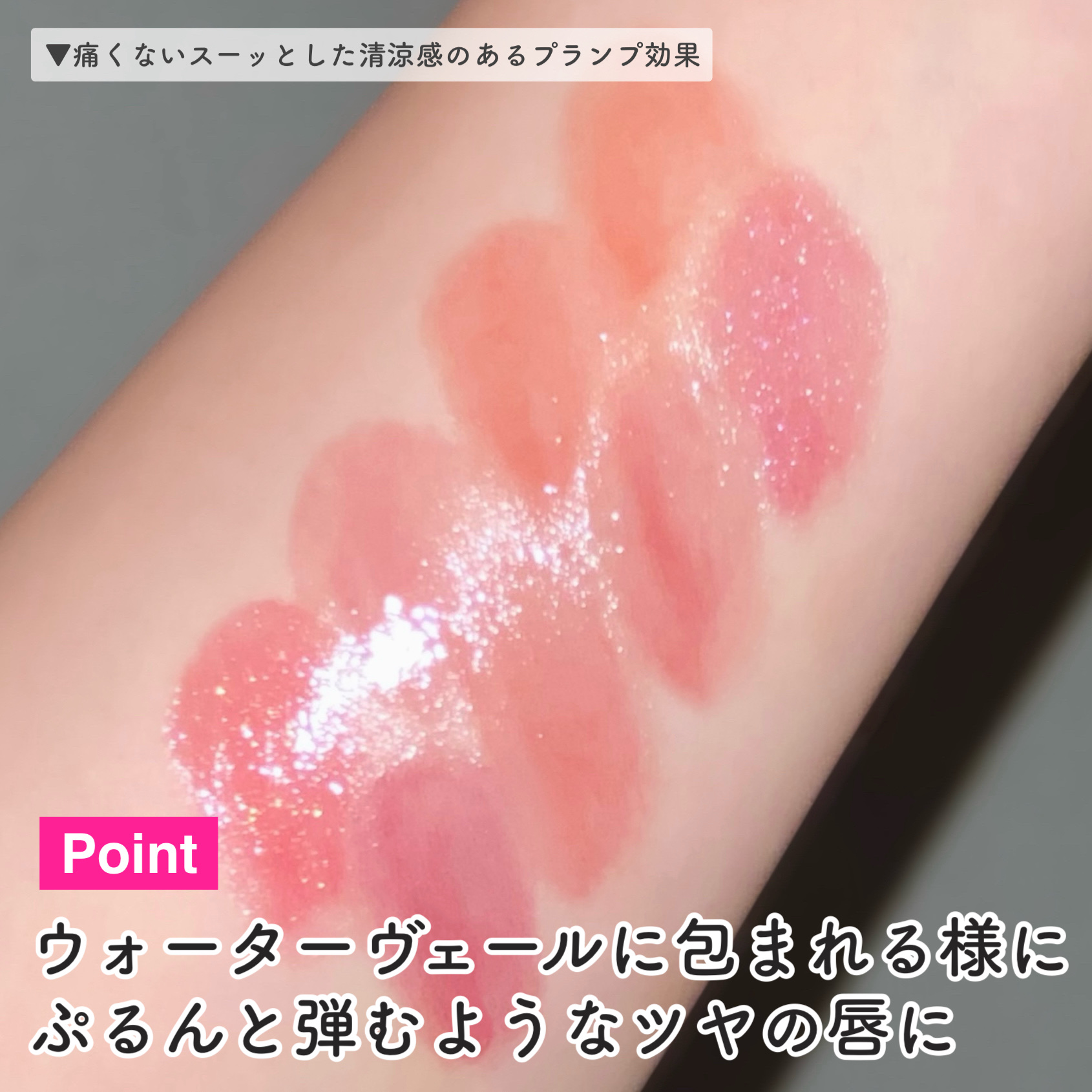 - うるんだツヤで、ぷっくり*唇 クリアな発色で、うるおい色づく口元に 1.輝きあふれるようなツヤ 輝きがあふれるような、濃密なツヤ感がつづく 2. 立体的な、ぷっくり感* うるおいツヤやかで立体的な、ぷっくり感*のある唇を演出。 3.シアーでクリアな発色 透け感があり、重ねることで、より鮮やかな発色に 4.うるおい感で、唇をなめらかに とろけるように密着して、ぷっくり*とした滑らかな唇に。 *乳酸メチル(整肌成分)の冷感、保湿成分(ツバキ種子油、ヒマワリ種子油、アーモンド油、マカデミア種子油、ヒマシ油)によるメイクアップ効果