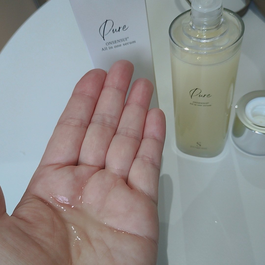 pure オールインワンセラム<二層式美容液>をお試しさせて頂きました。こちらは振って混ぜ合わせてから使うタイプのオールインワンセラムです。榊原温泉の温泉水の使用でマグネシウム・ナトリウム・カルシウムといったミネラル成分が絶妙なバランスで含ま...