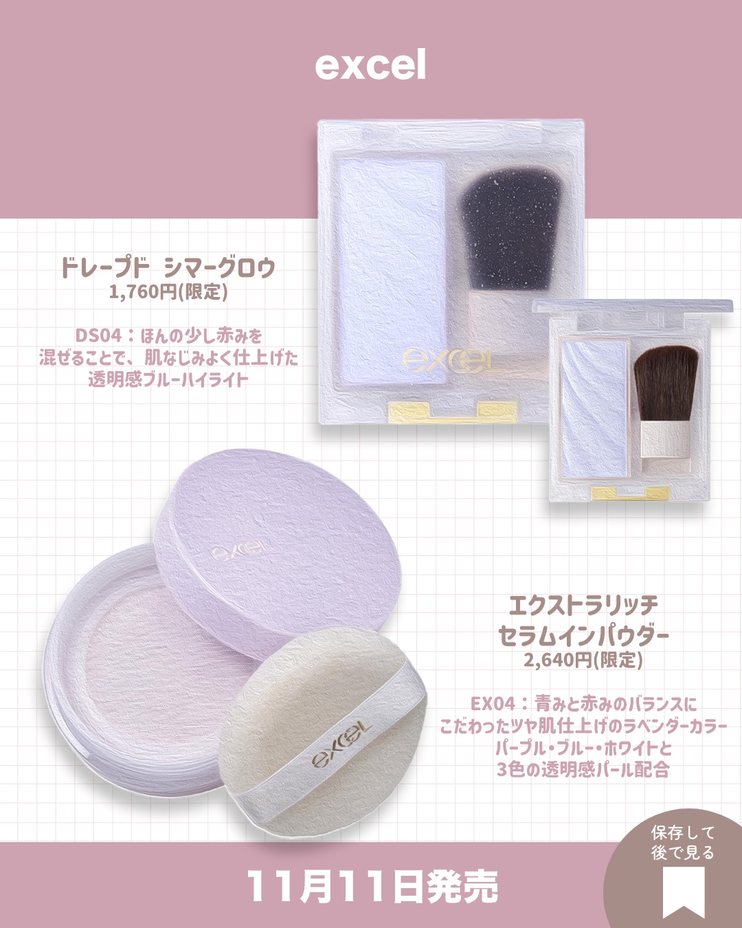 この冬イチオシのしっとり系パウダー✨excelエクストラリッチセラムインパウダーEX04 シマーラベンダー¥2,640毎年冬になると発売されるエクセルのパウダー、今年はツヤ感あふれるラベンダーカラーが限定で登場しています☝️パッケージは淡いパ...