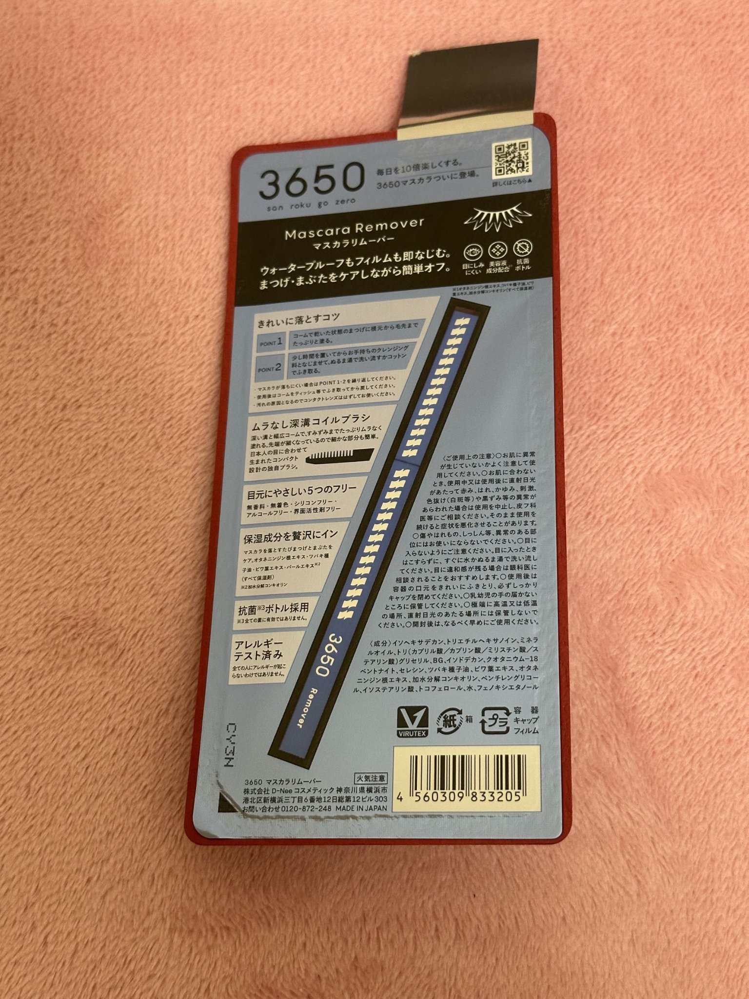 【3650マスカラリムーバー】マスカラと見た目が似ているので、最初はちょっと戸惑いましたが、取り出すと幅広コームに深い溝。先端が細くて、根元や下まつげにも塗りやすい形になっています。乾いたまつげに、マスカラを塗るように根元から毛先まで。少しな...