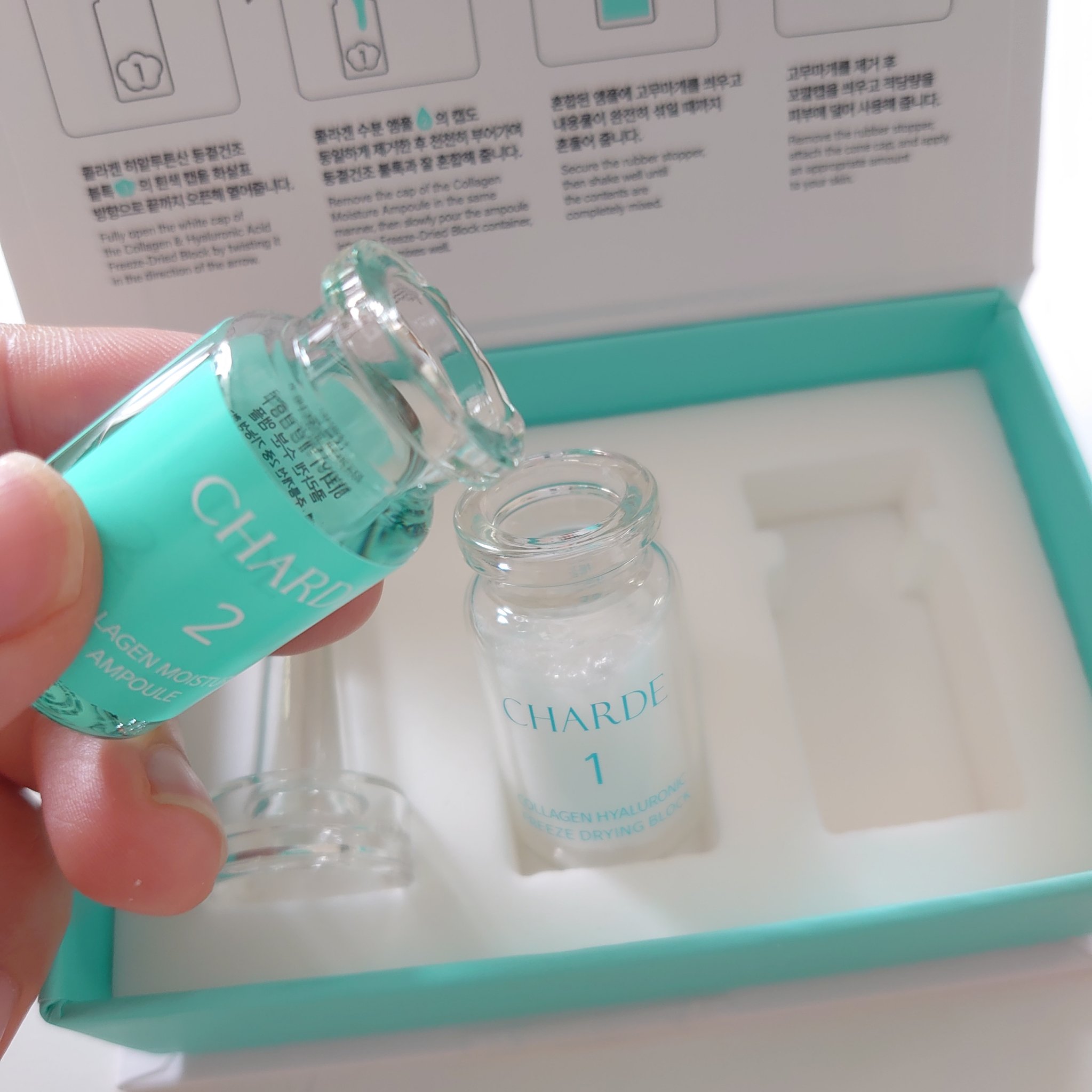 CHARDEクラウドアンプルフリーズドライされたヒアルロン酸+コラーゲン剤と水分エッセンスを混ぜて使うよ✨スーッと溶けていくのが見ていて楽しい♪よく振ってから使ってね!とろみがあるテクスチャーで肌馴染みがいい印象◎1剤は防腐剤フリーなので開封...