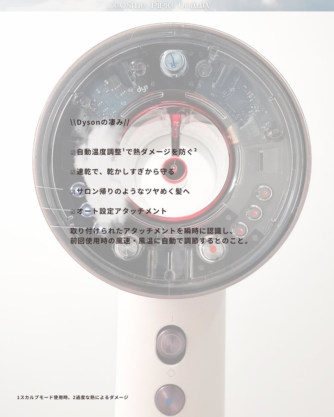 頭皮と髪のケアでツヤめく髪へ。 ニーズに応じて使い分けが可能な3つのアタッチメント付き! しっかりとした風量で速乾なのに熱くなりすぎないのですごく使いやすかったです! 髪に優しそうな使い心地でこれは欲しくなりました♡