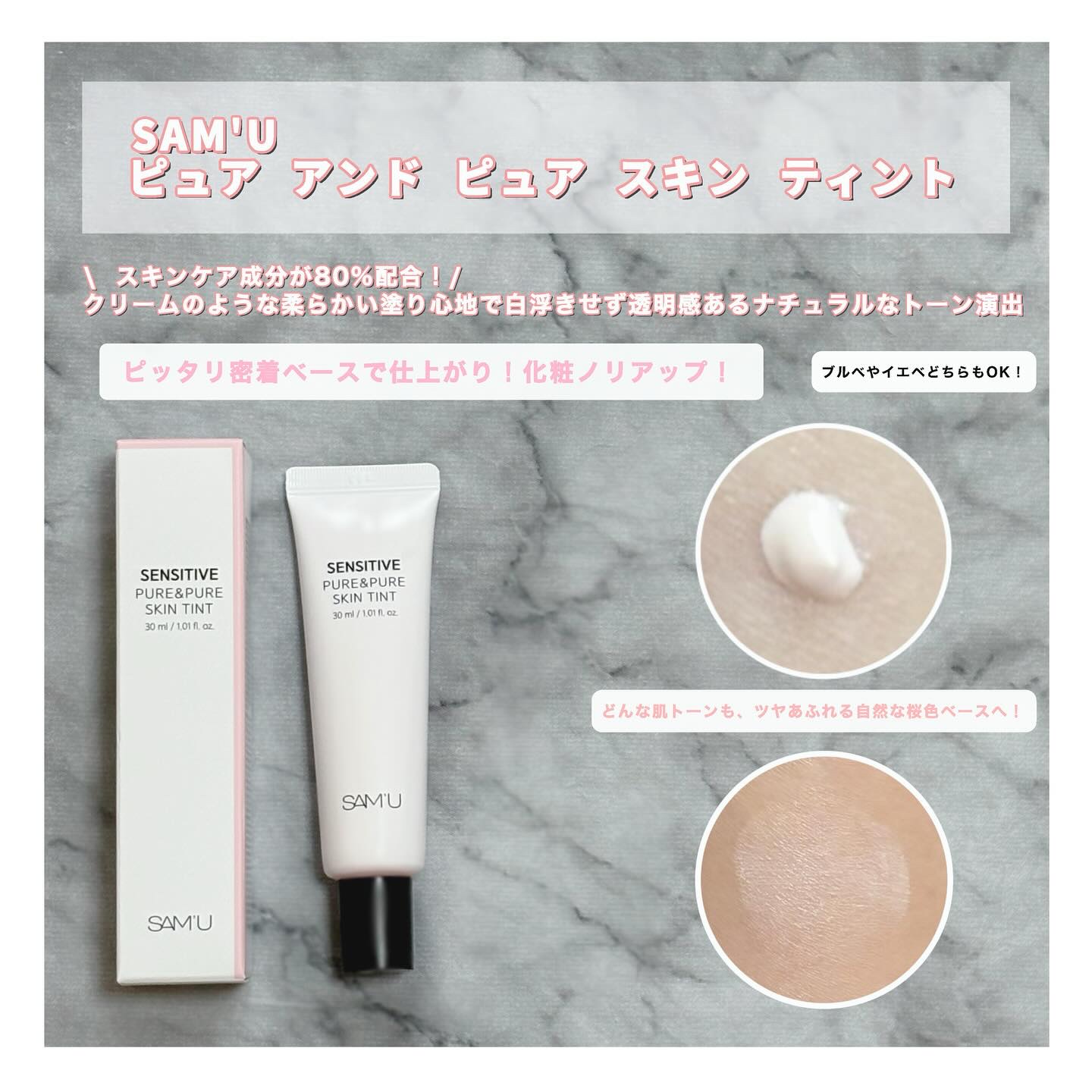 SAM'U【サミュ】ピュアアンドピュアスキンティント30mLSPF30PA++SAM'Uアンバサダー投稿です🗣️ピュアアンドピュアスキンティントのPOINT✨スキンケア成分が80%配合されクリームのような柔らかい塗り心地で白浮きせず透明感ある...