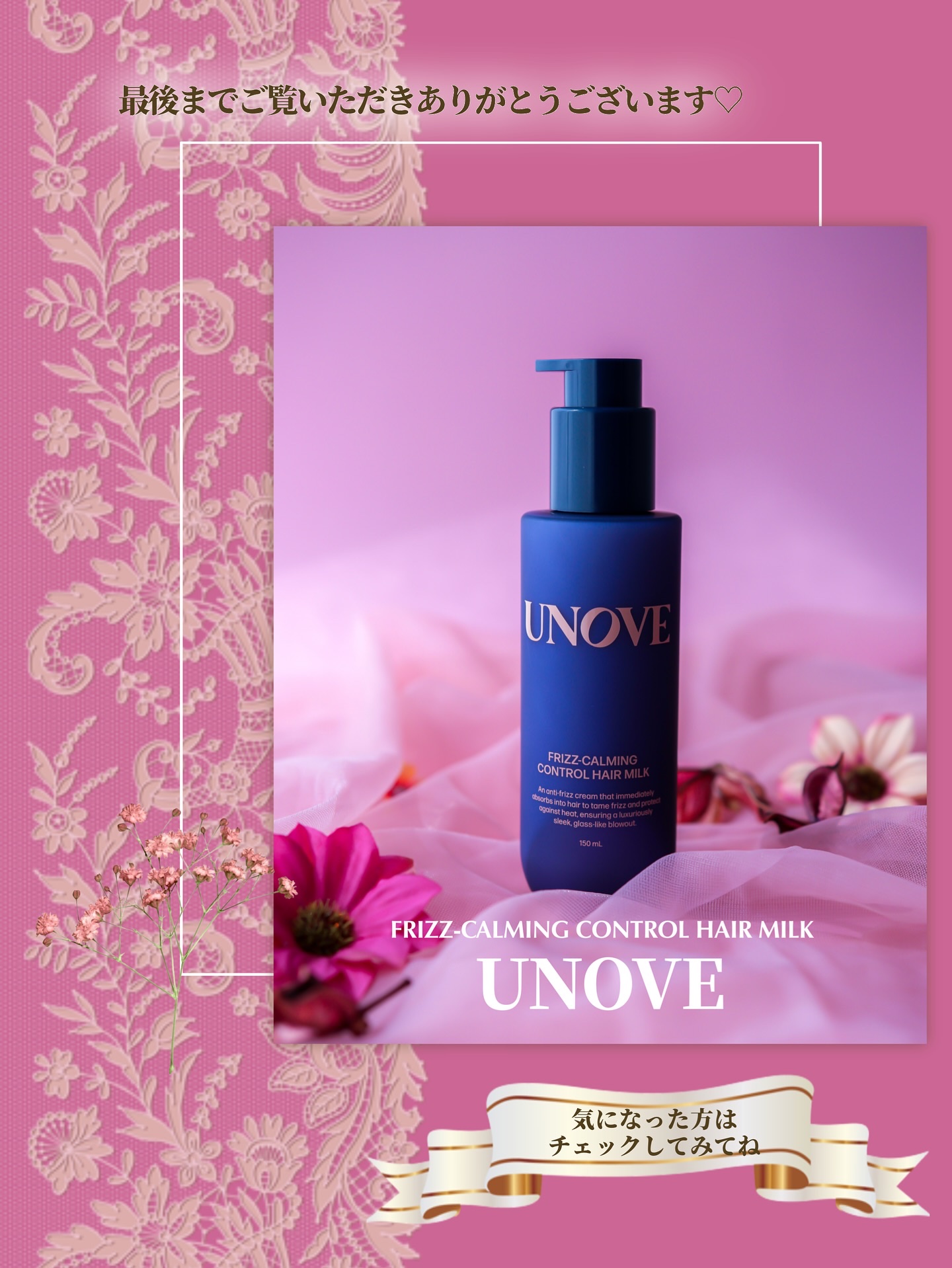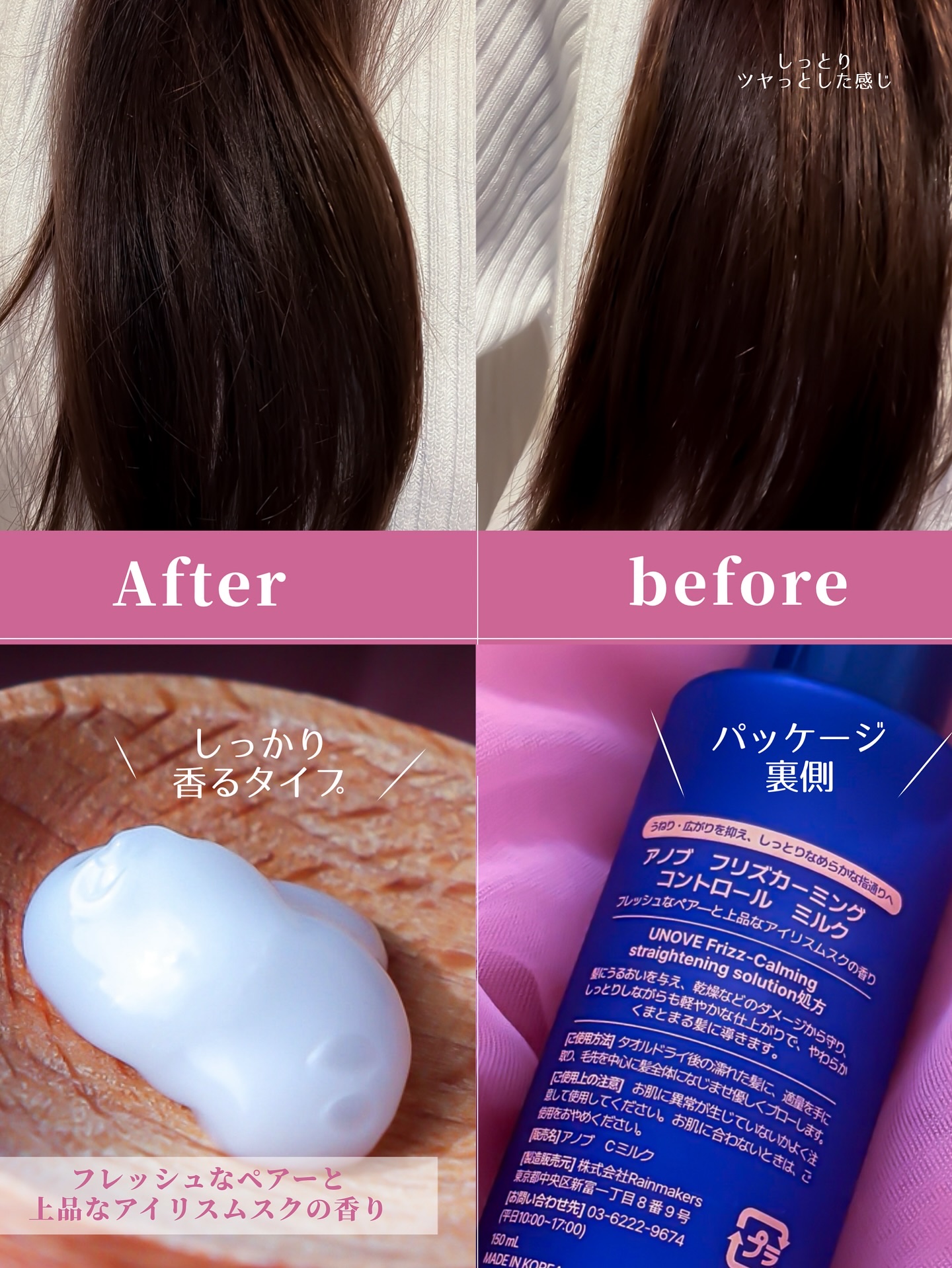 UNOVEさまからいただきました🍼ˊ˗UNOVEフリズカーミングコントロールヘアミルクアノブのうねり・広がりケアラインからヘアミルクが誕生.ᐟ.ᐟ✓ヒートプロテクトコンプレックス✓フレッシュな ペアーとアイリスムスクの上品な香り✓8つの無添加...