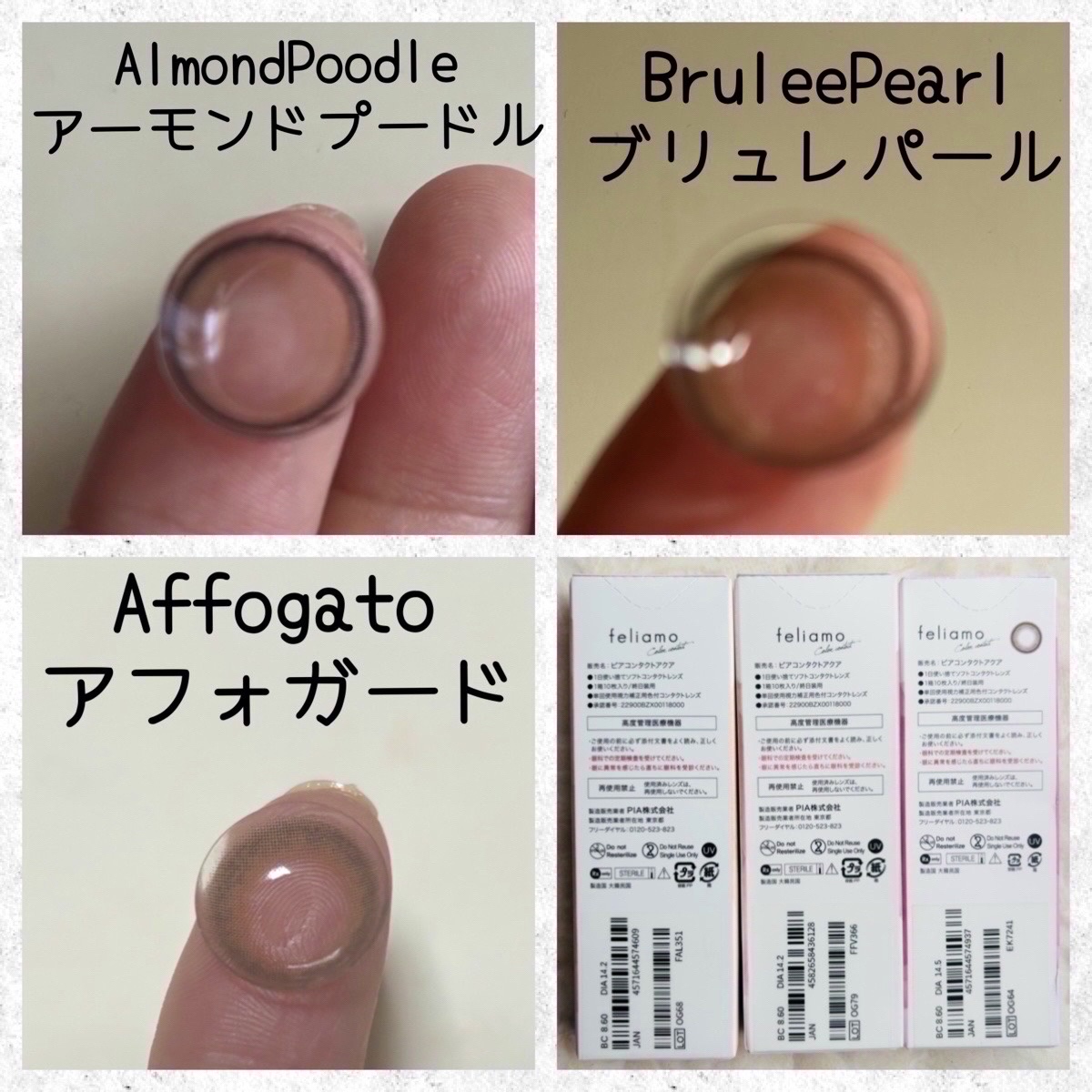 \feliamo新色レビュー/白石麻衣さんイメージモデルのfeliamoから新色2色登場🤍(1monthも同時に発売💡)アーモンドプードルDIA:14.5mm着色直径:13.7mmBC:8.6mmブリュレパールDIA:14.2mm着色直径:1...