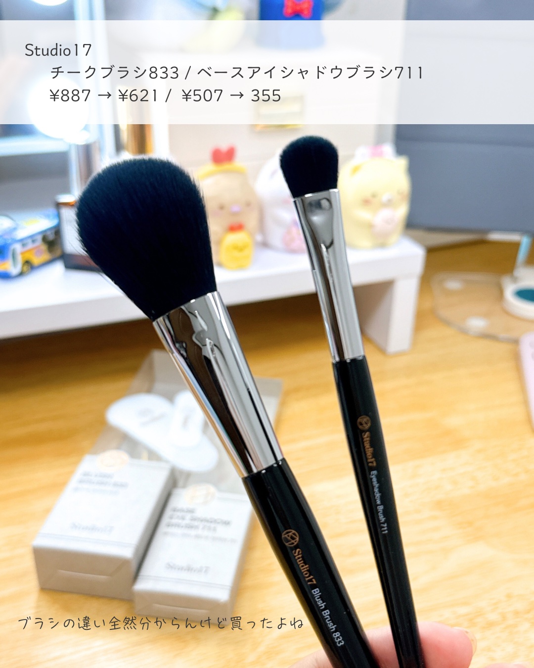 韓国で話題のツールブランド"studio17" 上質そうなのに手に取りやすい価格でずーっと気になってて アイメイクアップブラシセット ¥1.650(税込) 5種類のブラシが入っていてこれを持ってればだいたいのポイント系のメイクはできるし 私史上1番分厚いパフでびっくりした!幅約7cm・厚さ1.5cmでボリュームたっっぷり!