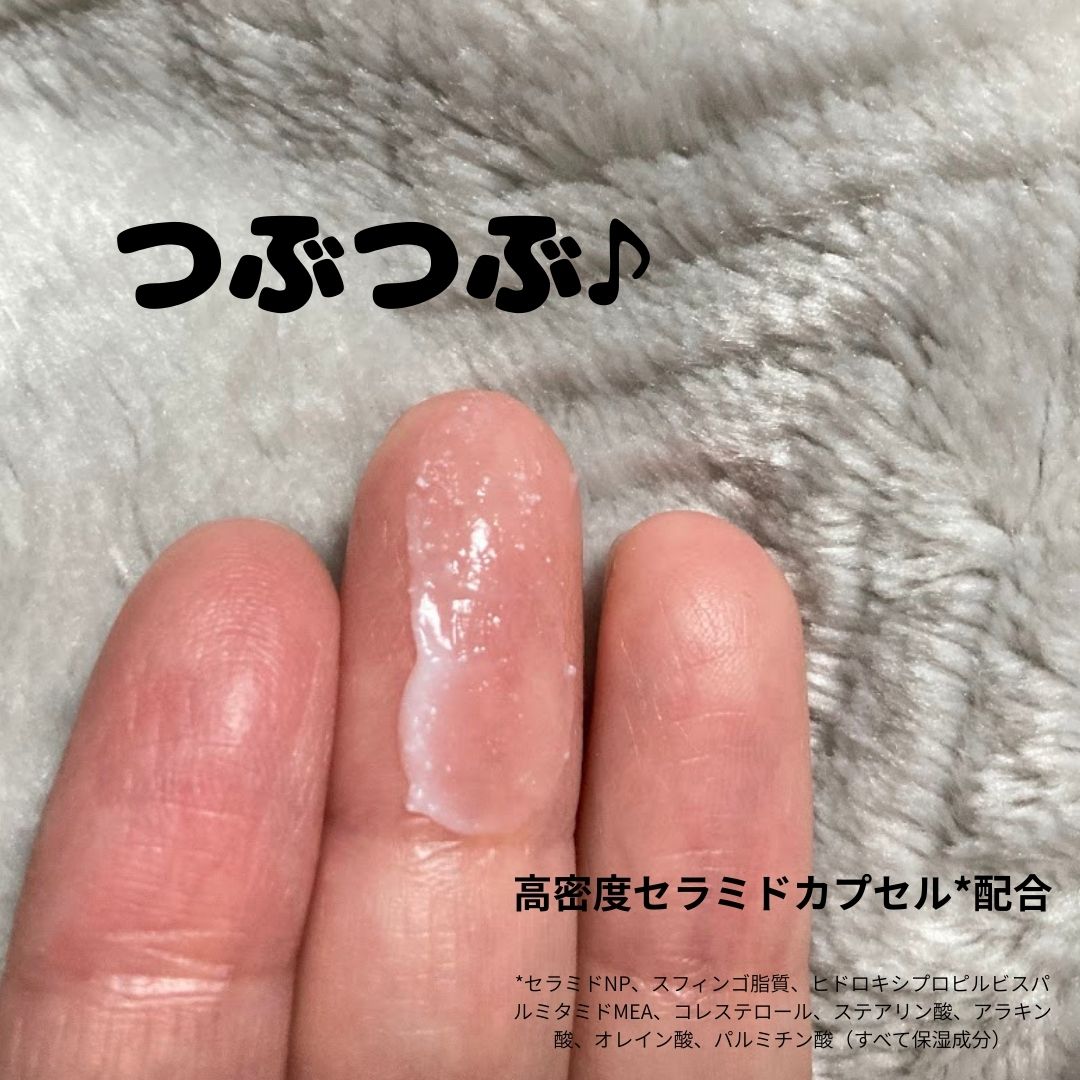 - 独自技術を用いた「高密度セラミドカプセル*¹」を1本に約100万個配合しそのつぶつぶと目に見えるカプセルが肌上で柔らかく溶けて角質層のすみずみまでうるおいで満たします。 保湿が120時間*⁵持続することでも人気を博しており乾燥しやすい敏感な肌におすすめのクリームです。 無香料、無着色、パラベン無添加、エタノール無添加、皮膚科医の協力のもとテスト済み*⁶ *1 セラミドNP、スフィンゴ脂質、ヒドロキシプロピルビスパルミタミドMEA、コレステロール、ステアリン酸、アラキン酸、オレイン酸、パルミチン酸 *5 ㈱エリード 2023.2.20~2023.3.23 敏感肌で乾燥悩みのある女性32人対象の人体適用試験実施(個人差があります) *6 全ての人に肌トラブル、アレルギーがおきないわけではありません。