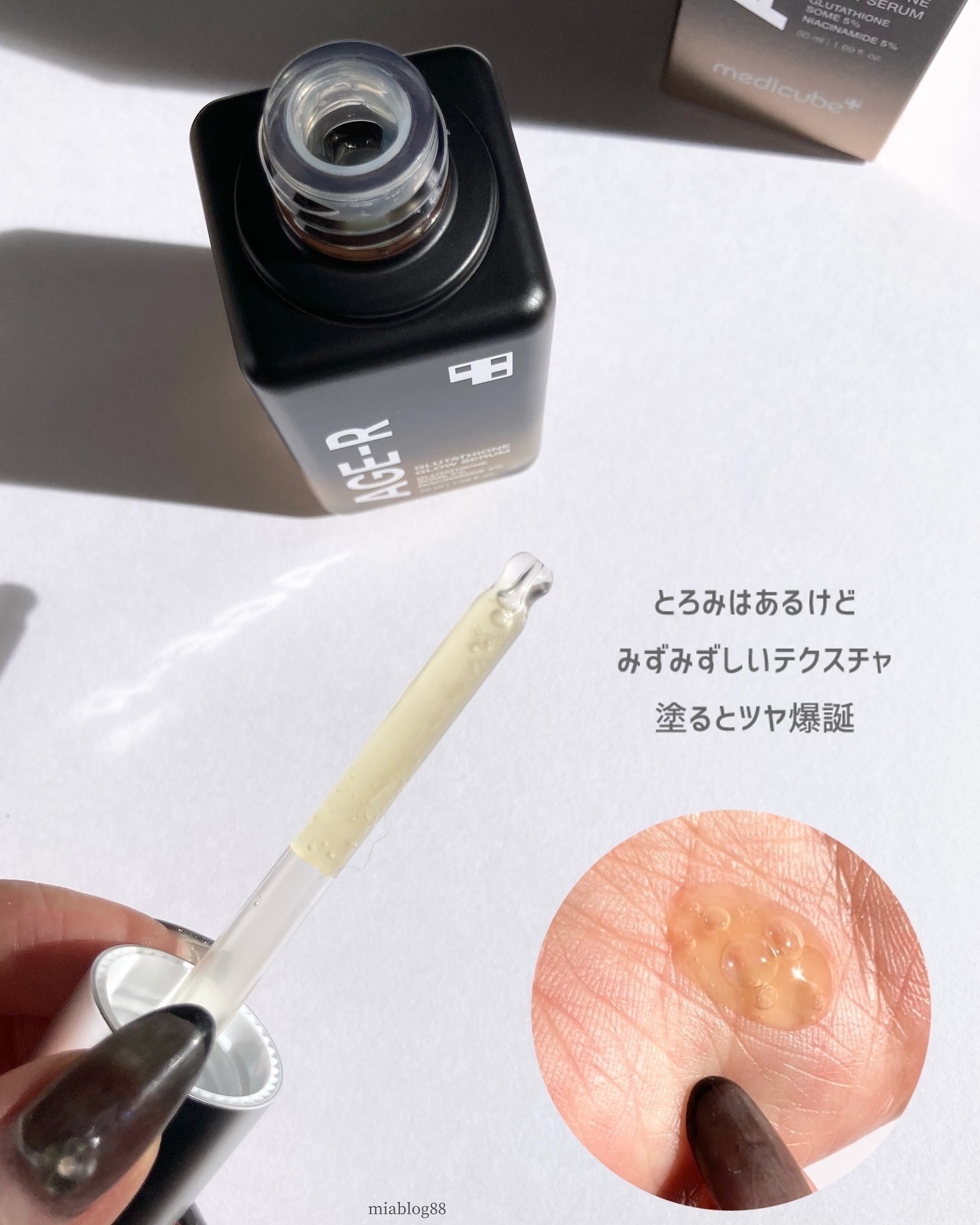 - 高純度99.4%のグルタチオン*を配合し、ハリツヤ肌に導く美容液です。 肌に馴染みやすいリン脂質製のカプセルにグルタチオン成分*を閉じ込め、肌の角質層までうるおいで満たします。 ☑グルタチオンソーム*:50,000ppm ☑ナイアシンアミド* 5%配合 ☑べたつかずしっとりツヤ肌 ☑美顔器AGE-R スキンブースターショットと一緒に使えます 化粧水などでお肌を整えたあと、適量を取り、お肌のキメに沿ってまんべんなく塗った後、やさしくなじませます。 *保湿成分 ■お肌に異常が生じていないかよく注意してご使用ください。化粧品がお肌に合わないとき即ち次のような場合には、使用を中止してください。そのまま使 用を続けますと、症状を悪化させることがありますので、皮膚科専門医等にご相談されることをおすすめします。また、傷やはれもの、しっしん等の異常が ある部位には、ご使用にならないでください。 (1)使用中、赤味、はれ、かゆみ、刺激、色抜け(白斑等)や黒ずみ等の異常があらわれた場合 (2)使用したお肌に、直射日光があたって上記のような異常があらわれた場合 ■目に入らないようご注意ください。目に入ったときは、こすらずにすぐに洗い流してください。その後、目に異物感など異常が残る場合は、眼科専門医へ ご相談されることをおすすめします。 ■極端に高温又は低温の場所、直射日光のあたる場所には保管しないでください。 ■開封後なるべく早めに使用してください。 ■ご使用後はフタをきちんと閉めてください。 ■乳児、子供の手の届かない所に保管してください。