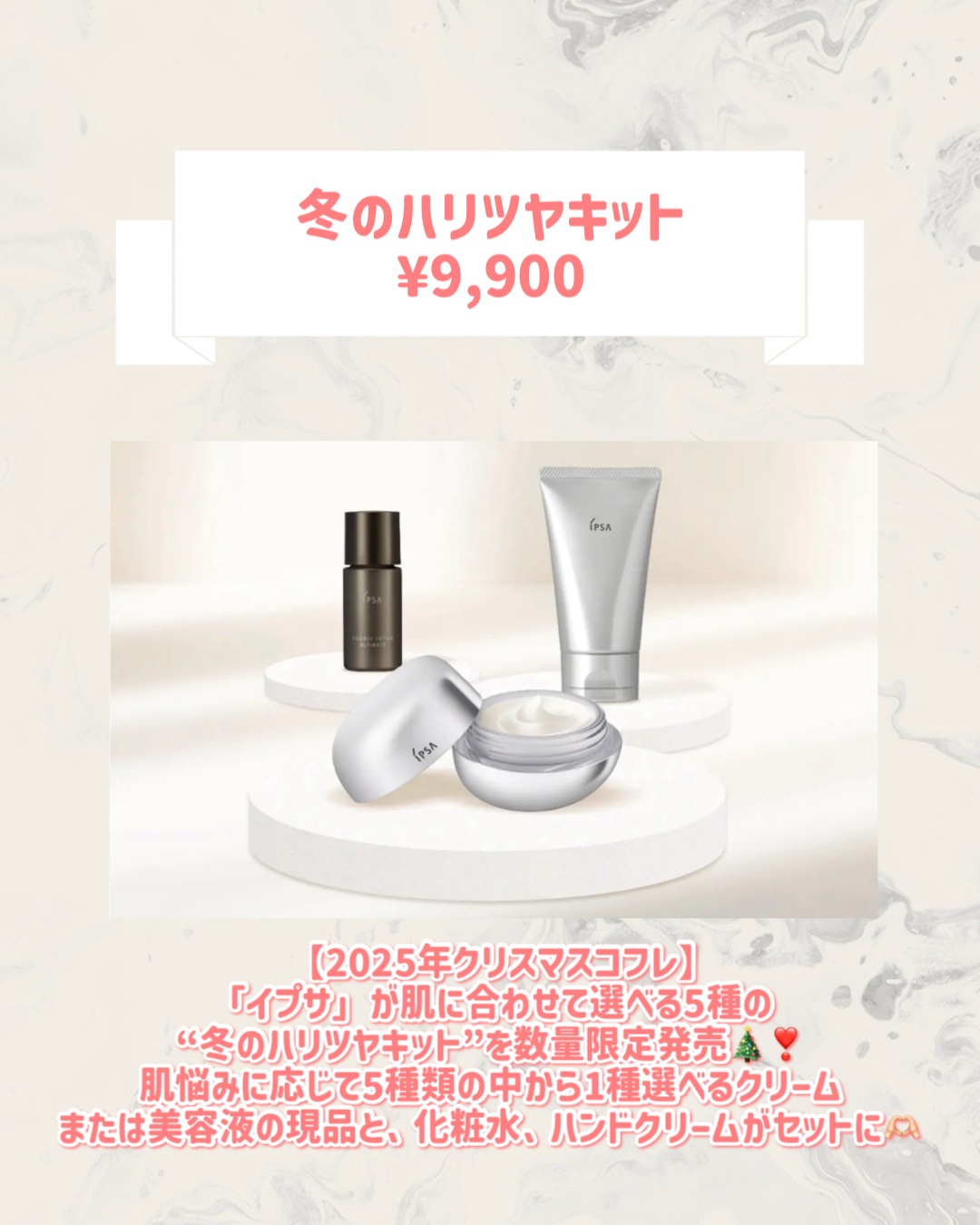 - 数量限定発売 深いうるおいで満たす、ツヤめくハリ肌へ 1人ひとりの肌に合わせて選べる5種の冬の「ハリツヤキット」登場 冬の訪れとともに、気温や湿度の低下により肌は乾燥ダメージを受けやすく、冷えによる機能低下も懸念される季節。 イプサは、そのような時季の肌を深いうるおいで満たし、生きいきとしたツヤとハリを引き出す「冬のハリツヤキット」を数量限定で発売いたします。 過酷な冬を迎える前に、自分の肌に寄り添うエイジングケア※2 を取り入れて、素肌をいたわりながら、自分らしく輝く冬へ。 ホリデーシーズンに贈りたい、イプサだけの「ハリツヤレシピ」です。 ※2 年齢に応じたハリ・うるおいを与えるお手入れのこと ※同キットは組み合わせの選択が可能です。 ※価格:税込9,900円~22,000円 (選択により価格が変わります) <セット内容> 1.クリームまたは美容液 (現品) 5種から1品選択 ①イプサ バウンス インテンス クリーム [50g] ②イプサ ターゲットエフェクト アドバンスト S (医薬部外品) [30g] ③イプサ ターゲットエフェクト アドバンスト G (医薬部外品) [23g] ④イプサ クリーム アルティメイトe (医薬部外品) [30g] ⑤イプサ セラム アクティブ [50mL] 2.化粧水 (特製サイズ) イプサ エッセンスローション アルティメイト [30mL] 3.ハンドクリーム イプサ ザタイムリセット SR (ハンドトリートメント) [70g] 店頭・公式オンラインショップ:2025年10月2日(木)より予約受付開始