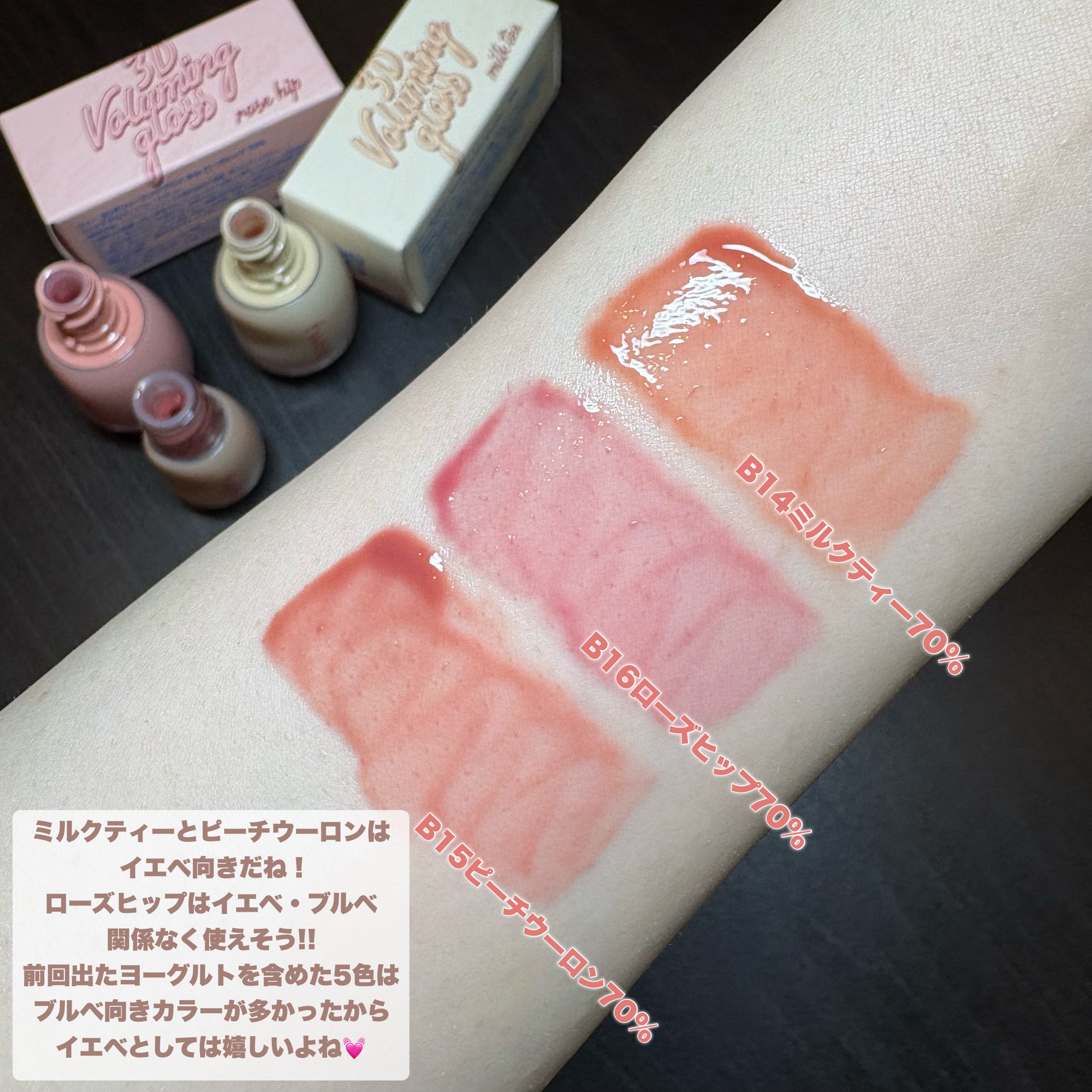 これは私が大大大好きなfweeの3Dボリューミンググロスの新色❣️ 今回のQoo10メガ割でfweeのベストセレクトセットを購入すると数量限定の特典で着いてくるんだけど… 私はバニラ70%が好きなんだけど、そのバニラ70%よりもブルベ寄りになったピンク💓 巷で噂の「うさぎ舌リップ」ってやつの色味に似てる!! しかもグロスだから擦ったら色残りしないけど、そもそももっちりしたテクスチャーで、落ちにくい!! そしてそのテクスチャーのお陰で、唇がもぉっちりぷりっと見える👀♡