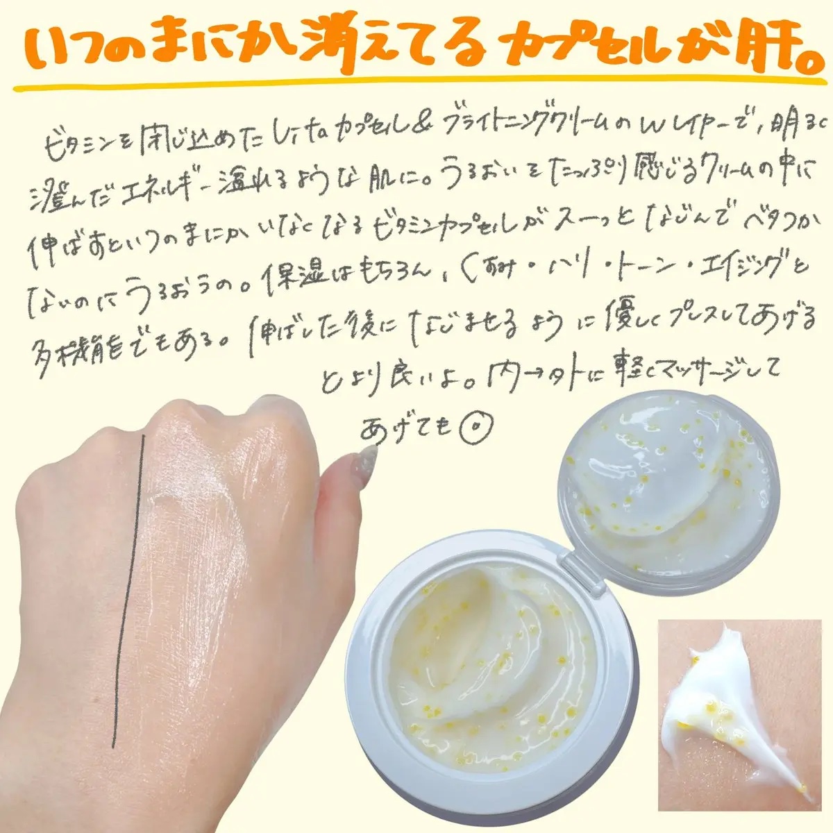 - ※リニューアル発売:旧称「ホワイトトリュフオイル カプセルクリーム」 ハリのあるお肌へ、保湿ダブルレイヤリングフォーミュラ - 溶け込むようになめらかに塗る密着保湿ベースと保湿光彩オイルカプセルが調和し、お肌にハリを与えます。 ローリングするほど明るく輝く光彩を放つVita-Cera Oil Capsule - セラミドとダルバブレンド-8オイルの強力な保湿でお肌をなめらかにするオイルカプセル 特許取得済みの無膜カプセルで残り感はZERO、甦る保湿光彩 - 特許を取得したメンブレン工法の無膜カプセルで、異物感なく素早く浸透し、しっかりとしたツヤ肌を実現します。 【ご使用方法】 適量を手にとり、肌にのばした後、手でやさしくこすりながらなじませます。 【使用上の注意】 お肌に異常が生じていないかよく注意して使用してください。 化粧品がお肌に合わないとき即ち次のような場合には、使用を中止してください。 そのまま使用を続けますと、症状を悪化させることがありますので、皮ふ科専門医等にご相談されることをおすすめします。 (1)使用中、赤味、はれ、かゆみ、刺激、色抜け(白斑等)や黒ずみ等の異常があらわれた場合 (2)使用したお肌に、直射日光があたって(1)のような異常があらわれた場合