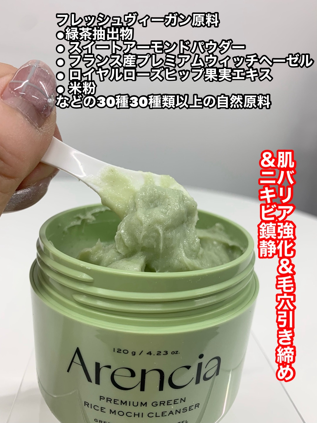 - <120g> カオリン、水、グリセリン、キサンタンガム、香料、チャ葉エキス、エチルヘキシルグリセリン、ツボクサエキス、スベリヒユエキス、カミツレ花エキス、ココイルメチルタウリンNa、オタネニンジン根エキス、デキストリン、1,2-ヘキサンジオール、ヒドロキシプロピルデンプンリン酸、EDTA-2Na、クチナシ果実エキス、塩化Na、ベントナイト、ヨモギエキス、ハマメリスエキス、コメエキス、ココイルイセチオン酸Na、クコ果実エキス、カラスムギ穀粒エキス、ユーカリ葉エキス、ティーツリーエキス、ナス果実エキス、コメ粉、チャ葉、ハス葉エキス、バオバブ果実エキス、コーヒー種子エキス、イチジク果実エキス、ハンゲショウエキス、クビレヅタエキス、ヤナギハッカエキス、アーモンド、ウラルカンゾウエキス <50g> グリセリン、ココイルイセチオン酸Na、水、アーモンド、1,2-ヘキサンジオール、ココイルメチルタウリンNa、チャ葉エキス、コメ粉、カオリン、ベントナイト、香料、チャ葉、ヒドロキシプロピルデンプンリン酸、塩化Na、キサンタンガム、デキストリン、エチルヘキシルグリセリン、クチナシ果実エキス、EDTA-2Na、ナス果実エキス、ウラルカンゾウエキス、クコ果実エキス、カラスムギ穀粒エキス、カミツレ花エキス、イチジク果実エキス、クビレヅタエキス、バオバブ果実エキス、ハマメリスエキス、ツボクサエキス、ハンゲショウエキス、スベリヒユエキス、コメエキス、ヨモギエキス、ハス葉エキス、ユーカリ葉エキス、オタネニンジン根エキス、コーヒー種子エキス、ティーツリーエキス、ヤナギハッカエキス