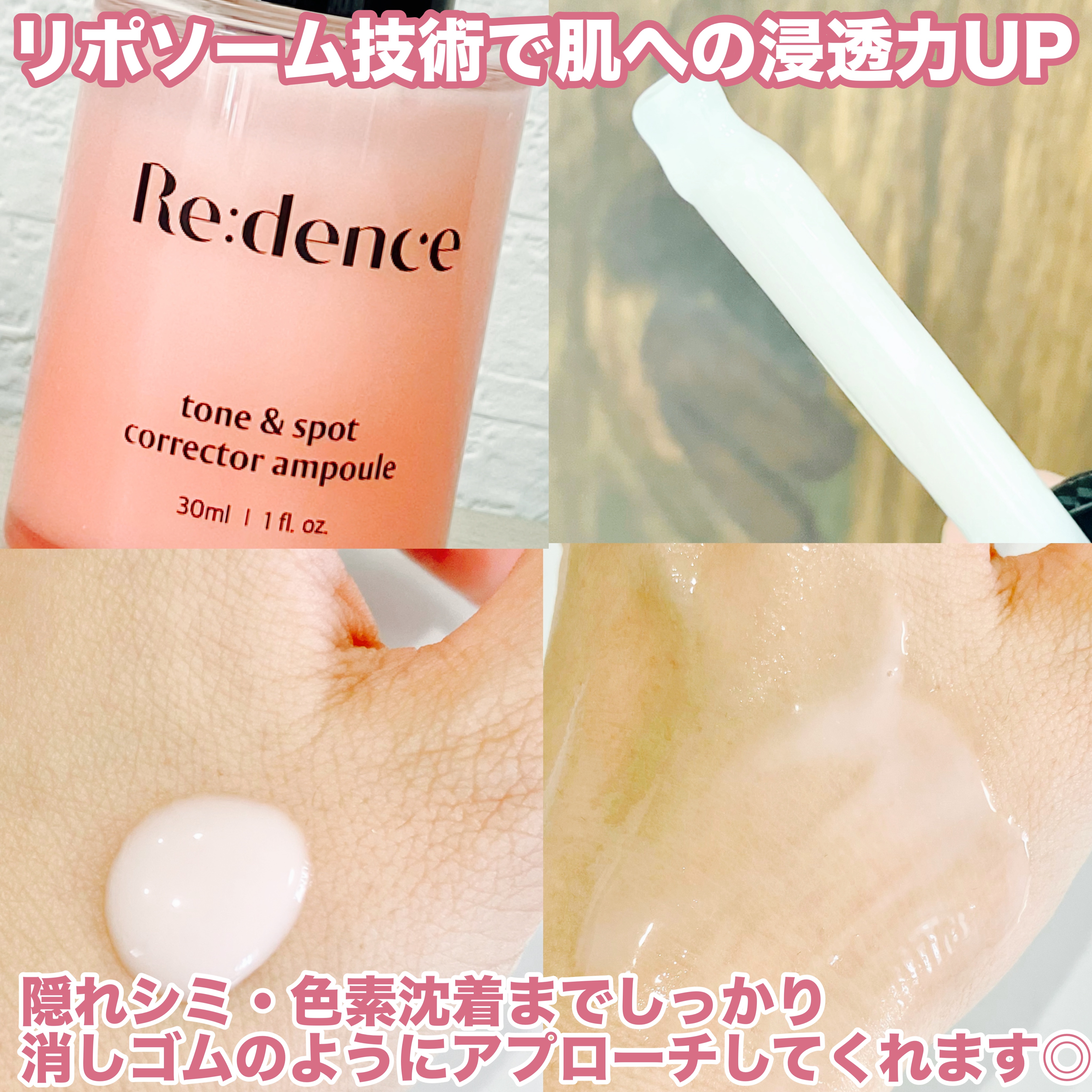 リデンストーン&スポットコレクターアンプルナイアシンアミドとビタミン成分配合✨シミやくすみにアプローチしてくれるアンプルだそうです💗みずみずしいテクスチャーで伸びがよく使い心地が良かったです🥰#redence#リデンス#チェリートーン...