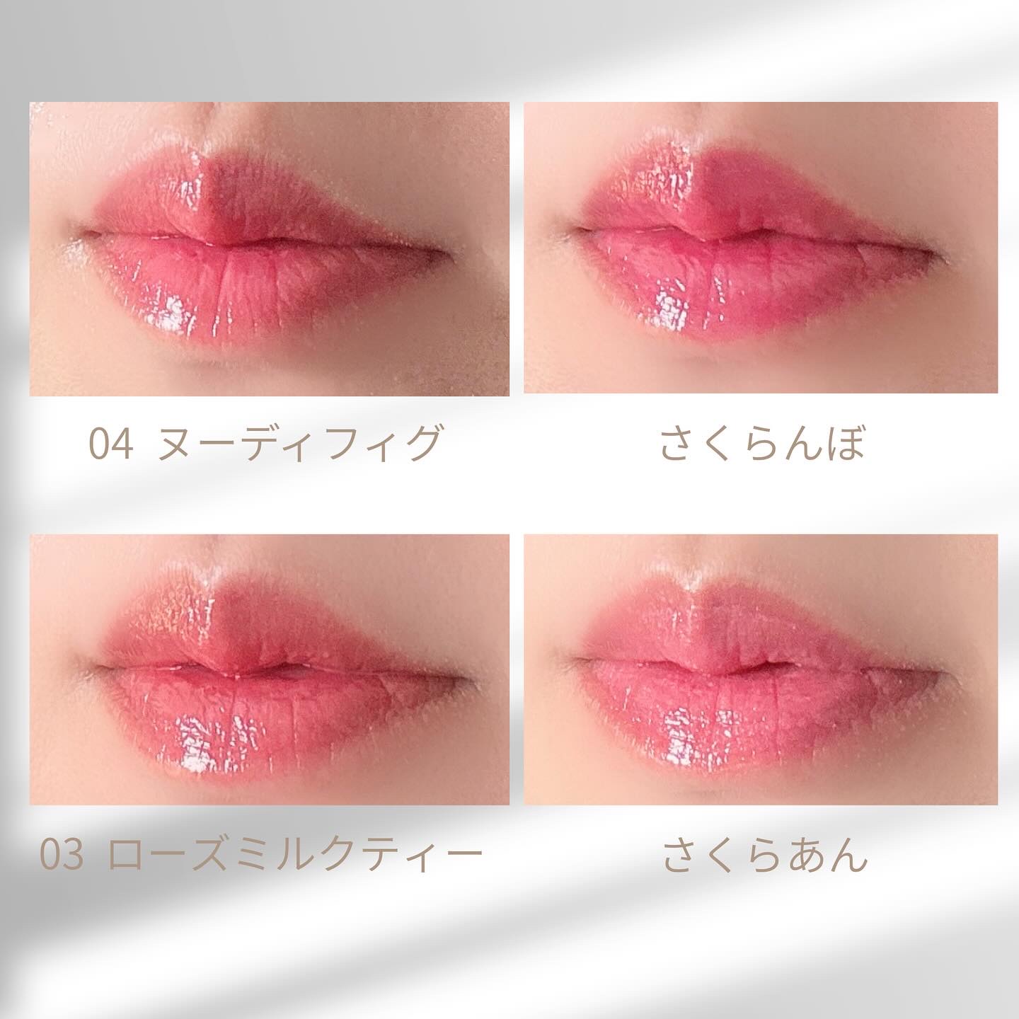 - <01 ジェントルピーチ> 水添ポリイソブテン、テトラ(ヒドロキシステアリン酸/イソステアリン酸)ジペンタエリスリチル、ヒドロキシステアリン酸エチルヘキシル、トリメリト酸トリトリデシル、水添ロジン酸メチル、ダイマージリノール酸(フィトステリル/イソステアリル/セチル/ステアリル/ベヘニル)、ジ安息香酸PG、合成ワックス、リンゴ酸ジイソステアリル、パラフィン、マカデミアナッツ脂肪酸フィトステリル、シリル化シリカ、イソステアリン酸ソルビタン、(VP/ヘキサデセン)コポリマー、酸化チタン、パルミチン酸デキストリン、マイクロクリスタリンワックス、トリイソステアリン酸ポリグリセリル-2、酸化鉄、赤202、黄5、ジイソステアリン酸ポリグリセリル-2、水、アルガニアスピノサ核油、ホホバ種子油、BG、サトウカエデエキス、フェノキシエタノール、アサイヤシ果実エキス、フラガリアチロエンシス果実エキス、クコ果実エキス、クロミグワ果実エキス、クロフサスグリ果実エキス、セイヨウヤブイチゴ果実エキス、キイチゴエキス、ローブッシュブルーベリー果実エキス、クランベリー果実エキス、ビルベリー果実エキス、エチルヘキシルグリセリン <02 アップルシナモン> 水添ポリイソブテン、テトラ(ヒドロキシステアリン酸/イソステアリン酸)ジペンタエリスリチル、ヒドロキシステアリン酸エチルヘキシル、トリメリト酸トリトリデシル、水添ロジン酸メチル、ダイマージリノール酸(フィトステリル/イソステアリル/セチル/ステアリル/ベヘニル)、ジ安息香酸PG、合成ワックス、パラフィン、リンゴ酸ジイソステアリル、マカデミアナッツ脂肪酸フィトステリル、シリル化シリカ、イソステアリン酸ソルビタン、(VP/ヘキサデセン)コポリマー、トリイソステアリン酸ポリグリセリル-2、パルミチン酸デキストリン、酸化鉄、マイクロクリスタリンワックス、酸化チタン、赤202、ジイソステアリン酸ポリグリセリル-2、黄5、水、アルガニアスピノサ核油、ホホバ種子油、BG、サトウカエデエキス、フェノキシエタノール、アサイヤシ果実エキス、フラガリアチロエンシス果実エキス、クコ果実エキス、クロミグワ果実エキス、クロフサスグリ果実エキス、セイヨウヤブイチゴ果実エキス、キイチゴエキス、ローブッシュブルーベリー果実エキス、クランベリー果実エキス、ビルベリー果実エキス、エチルヘキシルグリセリン <03 ローズミルクティー> 水添ポリイソブテン、テトラ(ヒドロキシステアリン酸/イソステアリン酸)ジペンタエリスリチル、ヒドロキシステアリン酸エチルヘキシル、トリメリト酸トリトリデシル、水添ロジン酸メチル、ダイマージリノール酸(フィトステリル/イソステアリル/セチル/ステアリル/ベヘニル)、ジ安息香酸PG、合成ワックス、リンゴ酸ジイソステアリル、パラフィン、マカデミアナッツ脂肪酸フィトステリル、シリル化シリカ、イソステアリン酸ソルビタン、(VP/ヘキサデセン)コポリマー、酸化チタン、トリイソステアリン酸ポリグリセリル-2、パルミチン酸デキストリン、マイクロクリスタリンワックス、酸化鉄、黄4、赤202、ジイソステアリン酸ポリグリセリル-2、青1、水、アルガニアスピノサ核油、ホホバ種子油、BG、サトウカエデエキス、フェノキシエタノール、アサイヤシ果実エキス、フラガリアチロエンシス果実エキス、クコ果実エキス、クロミグワ果実エキス、クロフサスグリ果実エキス、セイヨウヤブイチゴ果実エキス、キイチゴエキス、ローブッシュブルーベリー果実エキス、クランベリー果実エキス、ビルベリー果実エキス、エチルヘキシルグリセリン <04 ヌーディーフィグ> 水添ポリイソブテン、テトラ(ヒドロキシステアリン酸/イソステアリン酸)ジペンタエリスリチル、ヒドロキシステアリン酸エチルヘキシル、トリメリト酸トリトリデシル、水添ロジン酸メチル、ダイマージリノール酸(フィトステリル/イソステアリル/セチル/ステアリル/ベヘニル)、ジ安息香酸PG、合成ワックス、リンゴ酸ジイソステアリル、パラフィン、マカデミアナッツ脂肪酸フィトステリル、シリル化シリカ、イソステアリン酸ソルビタン、(VP/ヘキサデセン)コポリマー、酸化チタン、パルミチン酸デキストリン、マイクロクリスタリンワックス、トリイソステアリン酸ポリグリセリル-2、酸化鉄、黄4、赤202、ジイソステアリン酸ポリグリセリル-2、水、アルガニアスピノサ核油、ホホバ種子油、BG、サトウカエデエキス、フェノキシエタノール、アサイヤシ果実エキス、フラガリアチロエンシス果実エキス、クコ果実エキス、クロミグワ果実エキス、クロフサスグリ果実エキス、セイヨウヤブイチゴ果実エキス、キイチゴエキス、ローブッシュブルーベリー果実エキス、クランベリー果実エキス、ビルベリー果実エキス、エチルヘキシルグリセリン <05 シュガープラム> 水添ポリイソブテン、テトラ(ヒドロキシステアリン酸/イソステアリン酸)ジペンタエリスリチル、ヒドロキシステアリン酸