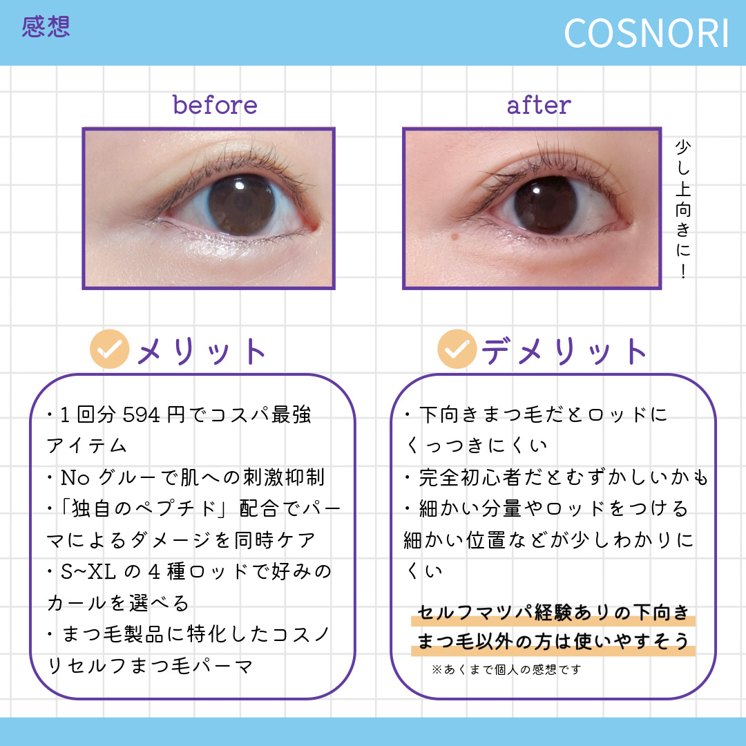 #PR@cosnori_jp🏷️COSNORIイージーアイラッシュリフトキット1回594円でコスパ最強!私は瞼が激重だからロッドがイマイチフィットしなくて何回か挑戦したけど理想のカールにはならなかった...🥲ロッドはシリコンだから瞼にはついて...