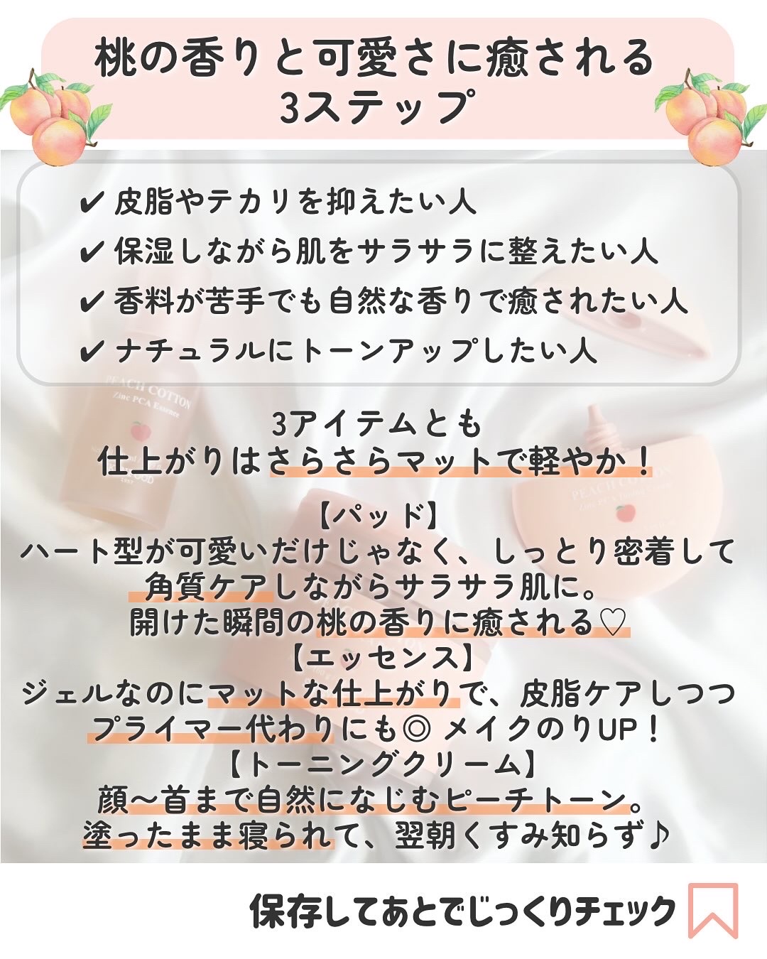 SKINFOOD⧉ピーチコットンジンクPCAパッド⧉ピーチコットンジンクPCAエッセンス⧉ピーチコットンジンクPCAトーニングクリーム韓国で話題のピーチコットンラインが日本にも上陸したよ🍑しっとりとした使用感だけど肌の表面はサラっとしててメイ...
