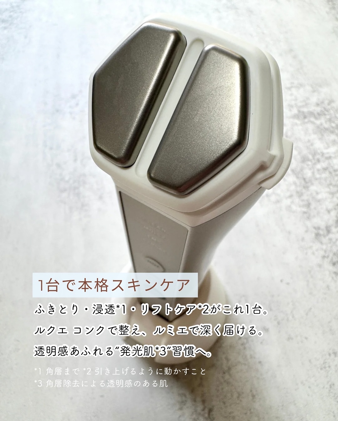 「ナリス化粧品」さまから商品提供をいただきました。美顔器ナリスルミエと拭き取り化粧水のルクエコンク❣❣ルミエは、除去・浸透*1・リフトケア*が叶う3in1美顔器。透明発光肌に導きます。嬉しいのが専用の化粧品は不要!いつものスキンケアで手軽にお...