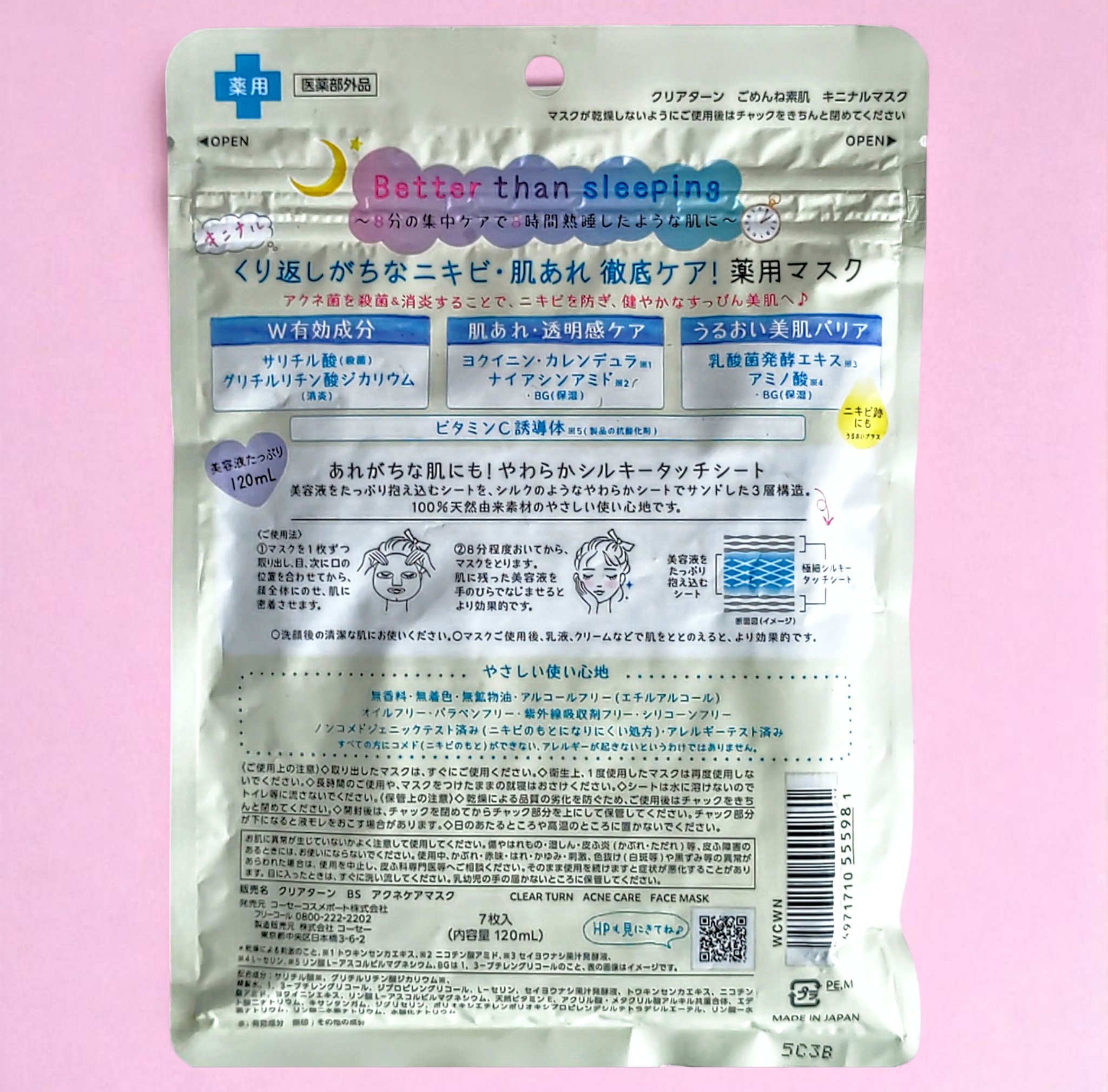 - くり返しがちなニキビ・肌あれ 徹底予防ケア!薬用マスク ①アクネ菌を殺菌&消炎することで、ニキビを防ぎ、健やかなすっぴん肌へ♪ W有効成分:サリチル酸(殺菌)・グリチルリチン酸ジカリウム(消炎) 肌あれ予防・透明感ケア:ヨクイニン・カレンデュラ※1・ナイアシンアミド※2・BG(保湿) うるおい美肌バリア:乳酸菌発酵エキス※3・アミノ酸※4・BG(保湿) ビタミンC誘導体※5(製品の抗酸化剤) ②あれがちな肌にも使える、やさしい使い心地 無香料・無着色・無鉱物油・アルコールフリー(エチルアルコール)・オイルフリー ・パラベンフリー・紫外線吸収剤フリー・シリコーンフリー・グリセリンフリー ノンコメドジェニックテスト済み(ニキビのもとになりにくい処方)・アレルギーテスト済み すべての方にコメド(ニキビのもと)ができない、アレルギーが起きないわけではありません ③やわらかシルキータッチシート 美容液をたっぷり抱え込むシートを、シルクのような柔らかいシートでサンドした3層構造シート。 ※1トウキンセンカエキス ※2 ニコチン酸アミド ※3セイヨウナシ果汁発酵液 ※4L-セリン ※5 リン酸L-アスコルビルマグネシウム、BGは1、3-ブチレングリコールのこと