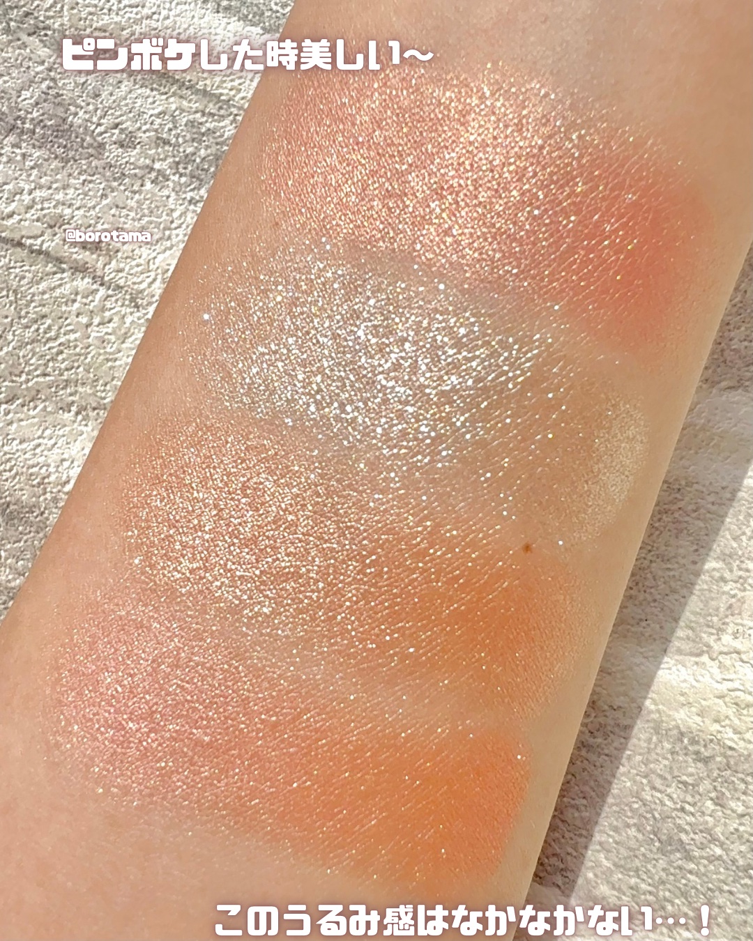 パケからもう可愛い…!ベストセラーの4色ハイライトパレットが進化。思いのままに纏う、未体験の輝き。多分このカラーブルベ向きなんだろうけどイエベ春でもかわいい、いける!粉質がしっとりしてて肌馴染み抜群上品に光ってくれる✨①キラキラ度たかめ。少し...