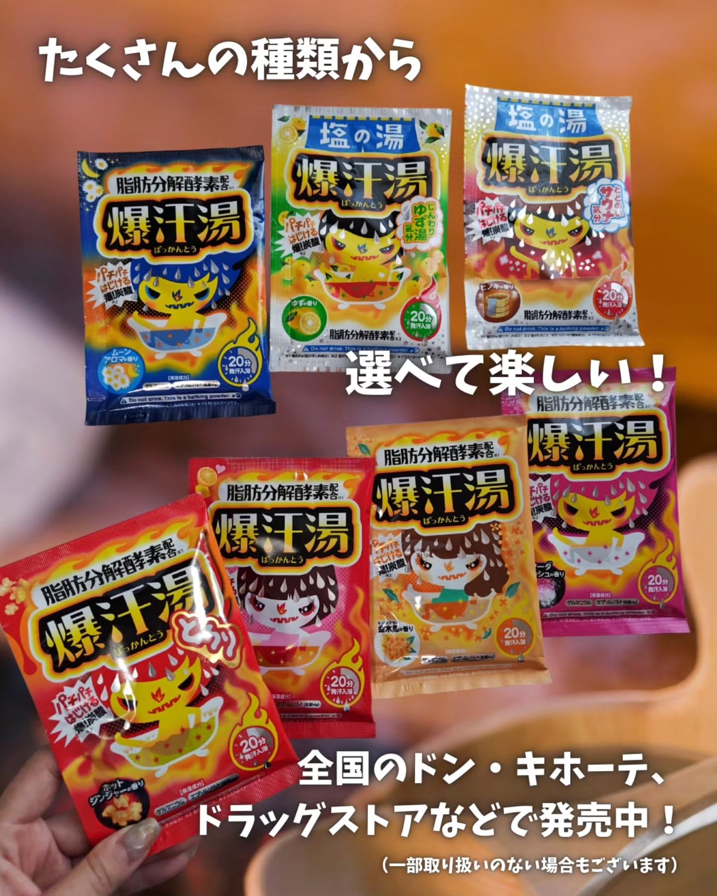 \お風呂時間が一気にイベント化🛁✨/ ✔️爆汗湯全7種 60g286円(税込)ソーダスカッシュの香りホットジンジャーの香り金木犀の香りムーンアロマの香りホットアロマの香り塩の湯ヒノキの香り塩の湯ゆずの香り💫全国のドン・キホーテ、ドラッグスト...