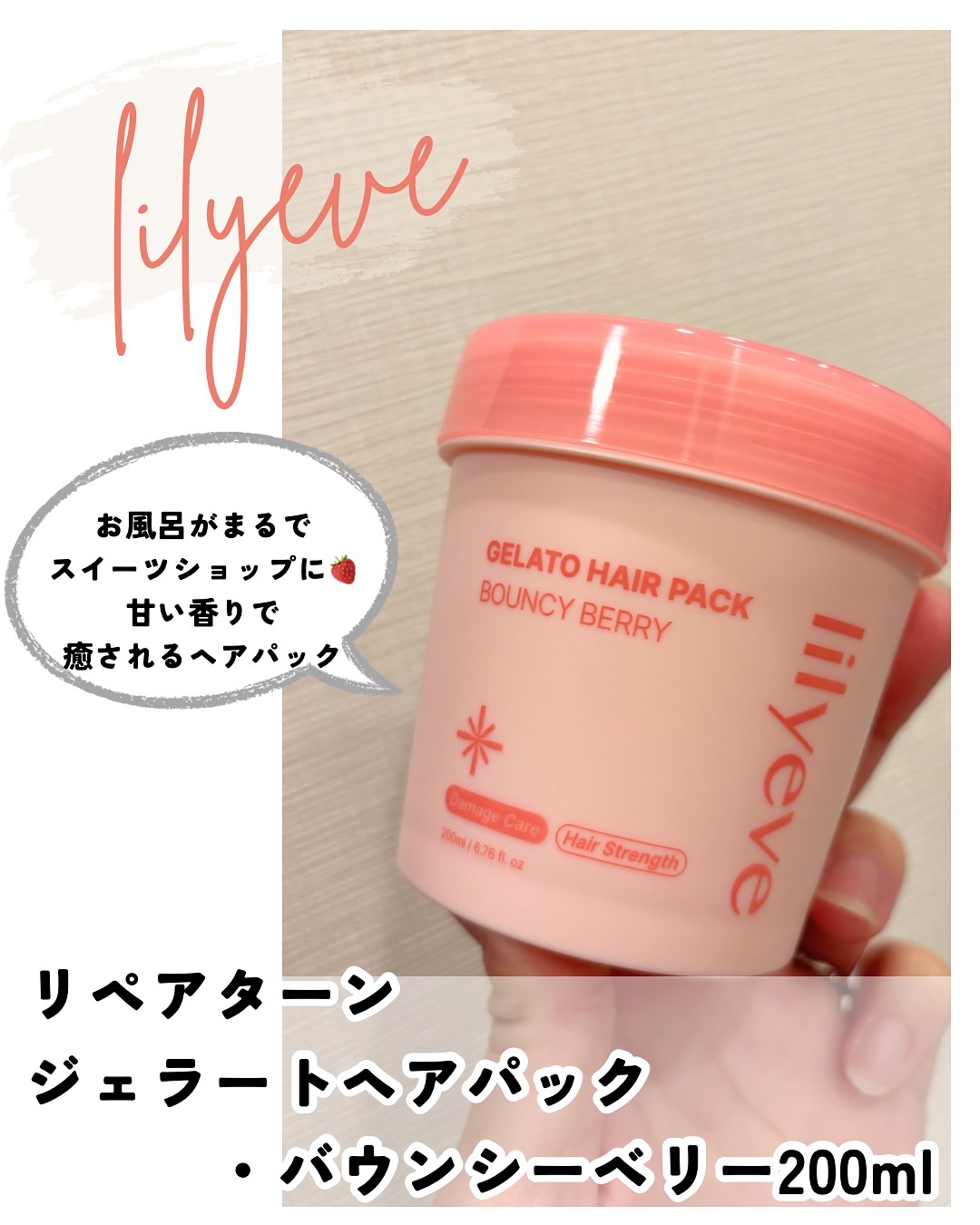 リペアターンジェラートヘアパック・バウンシーベリー200ml✨リリーイブのヘアケア新作🌟乾燥やパサつきが気になる髪を集中的にケア🎵ジェラートのような濃密テクスチャーで毛髪に密着するヘアパック💡パッケージがかわいい💕スイーツみたいなヘアパック✨...