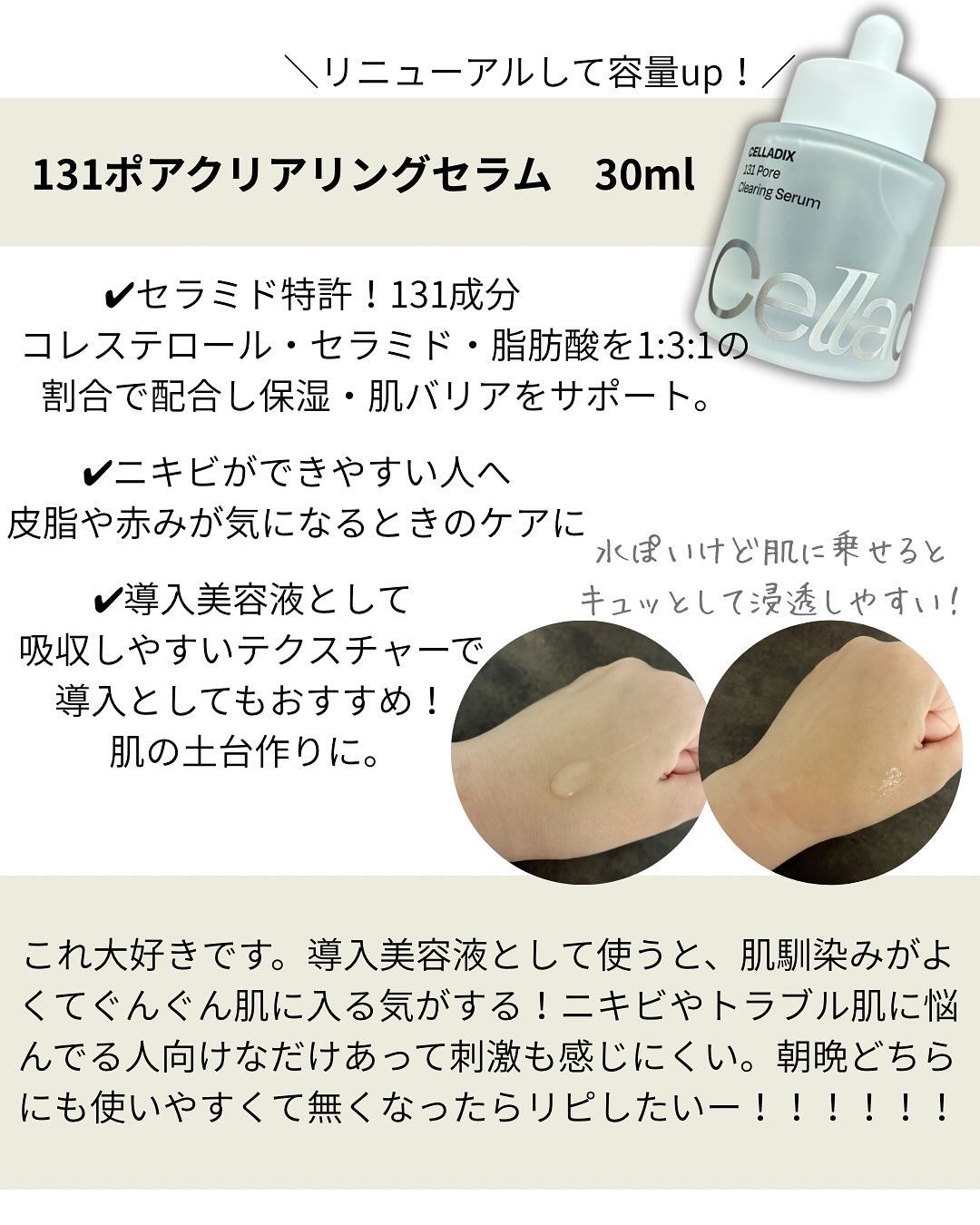 ニキビが気になる時にも使いたいセラム💫韓国セラディックス社の特許セラミド複合体「131成分」配合で肌バリアを集中ケア✨Celladix_jp(セラディックス)【131ポアクリアリングセラム】ニキビの原因になる皮脂つまりも柔らかくケアできるよ✨...