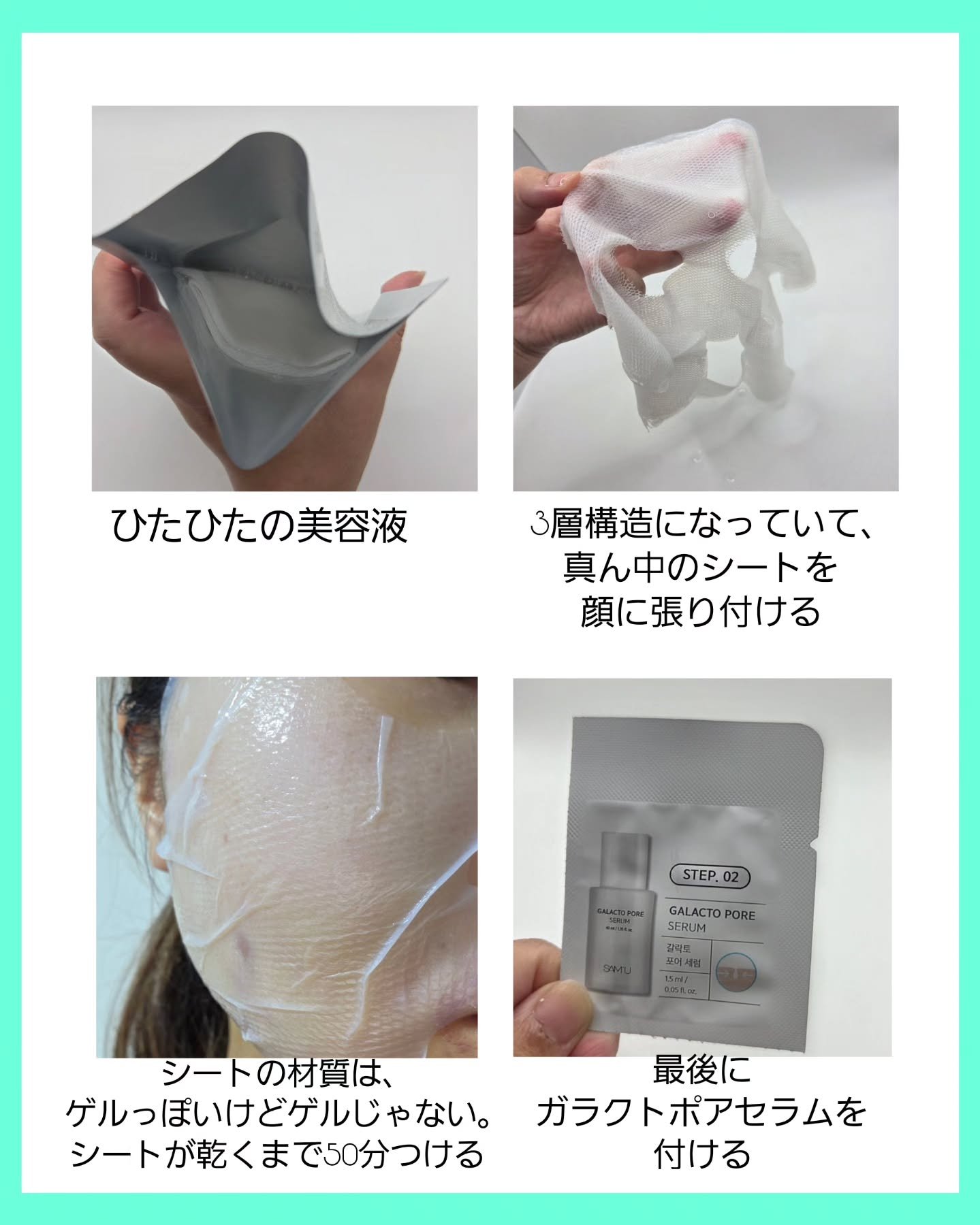- うるおい成分たっぷりのバイオセルロースマスクが肌に密着し、肌をなめらかに整えます。 さらにセラムがうるおいをプラスし、なめらかでもちもちとした肌印象へ導く2ステップスペシャルケアセット ガラクトシリーズより登場したスペシャルケアマスク! こだわりの2ステップケアで毛穴ケア+保湿効果のダブルケア。 果物や植物発酵エキスで作られた密着性の高い自然由来のやわらかバイオセルロースシートが肌にピタッと密着し毛穴に詰まった汚れを柔らかくしシートマスクへ吸着させることで角質除去と肌のキメを整えます。 さらにスペシャル毛穴ケアの仕上げとして毛穴ケアガラクトポアセラムで保湿、ハリケアや肌のキメを整え、毛穴を目立ちにくく肌をなめらかに整えます。