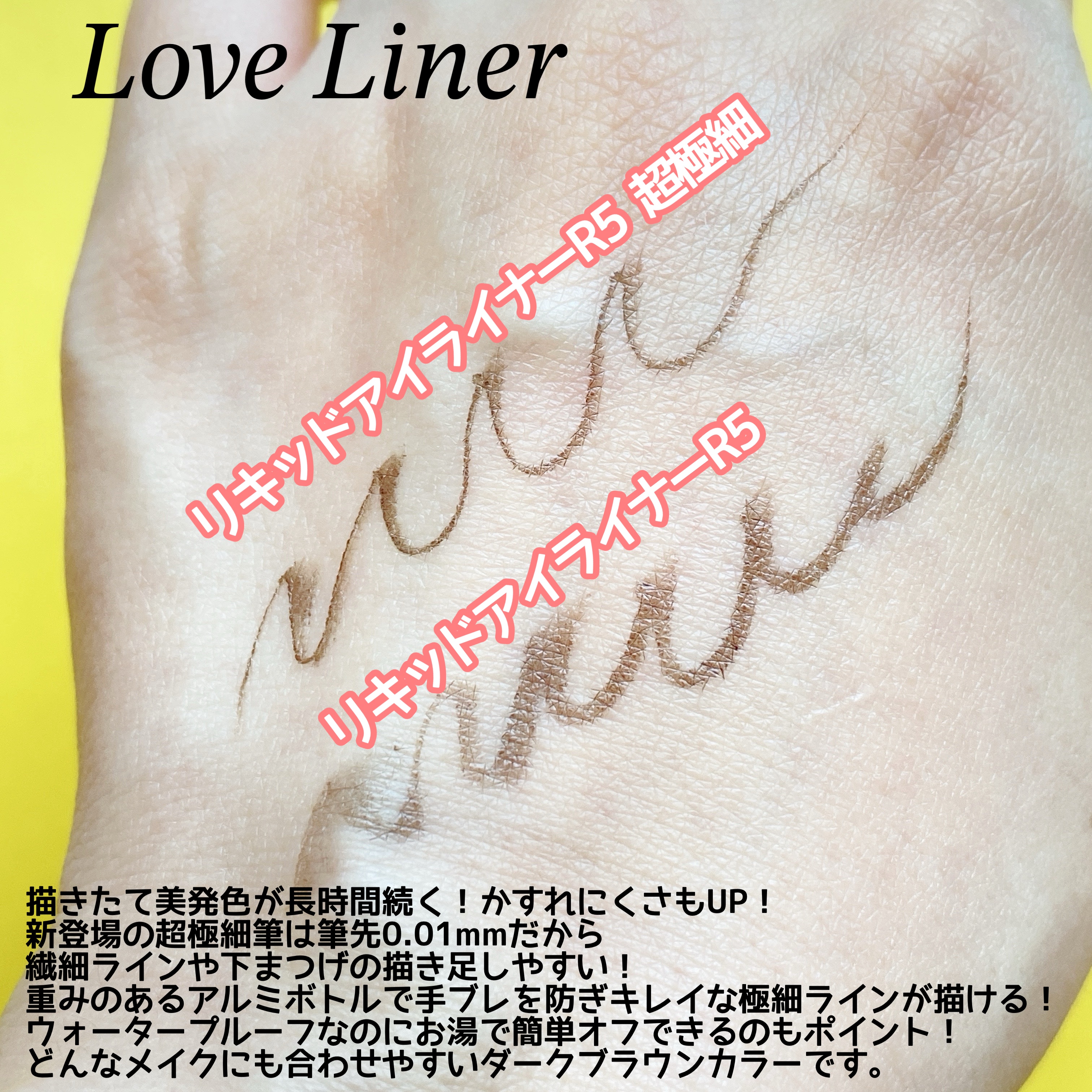 ラブライナーの人気リキッドアイライナーがリニューアル💫描きたて美発色が長時間続くリキッドアイライナーR5はかすれにくさもUPしたそうで最後までかすれずに描けるのようになったみたい新登場のリキッドアイライナーR5極細筆は筆先0.01mmで繊細ラ...