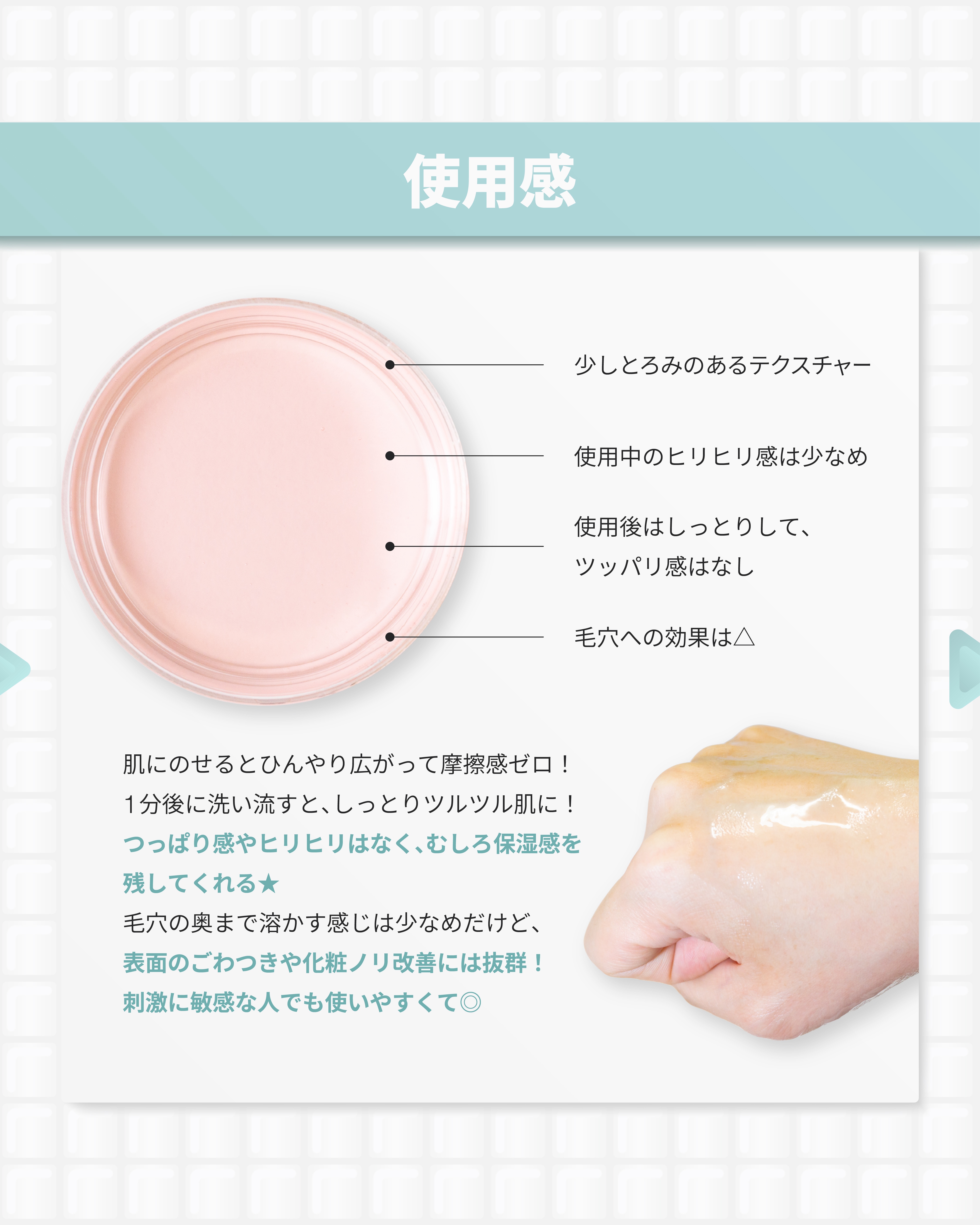 | ジェルっぽいテクスチャーで肌にスーッと伸び、洗い流した後はつるっとしたなめらか肌に。 | 詳細を見る | |