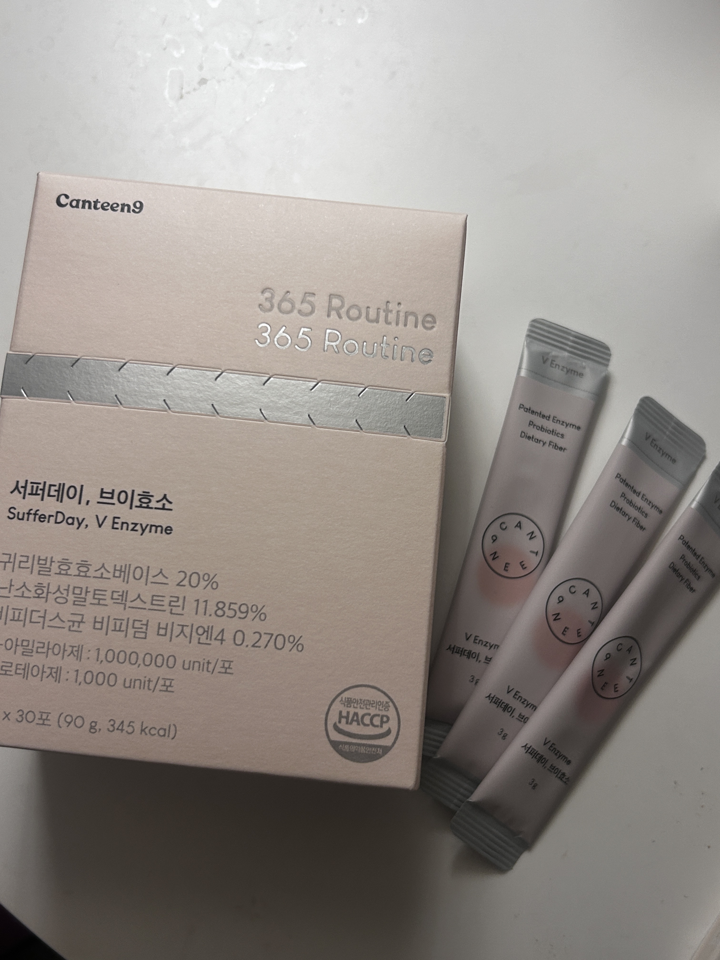 Canteen9の「365RoutineSufferDay,VEnzyme」を購入して飲んでみました✨️まず、スティックタイプで個包装になっているので持ち運びがしやすく、外出先でも手軽に摂れるのが便利です🫶🏻ほんのり甘酸っぱい風味で、水なしで...