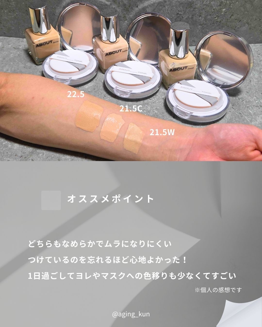 ABOUTTONE@abouttone_jpファンデーション2種類使ってみました。【スキンレイヤーフィットクッション】(21.5C/21.5W/22.5)スキンケア成分66%と高配合。軽いつけ心地で時間が経っても崩れにくいクッションファンデー...