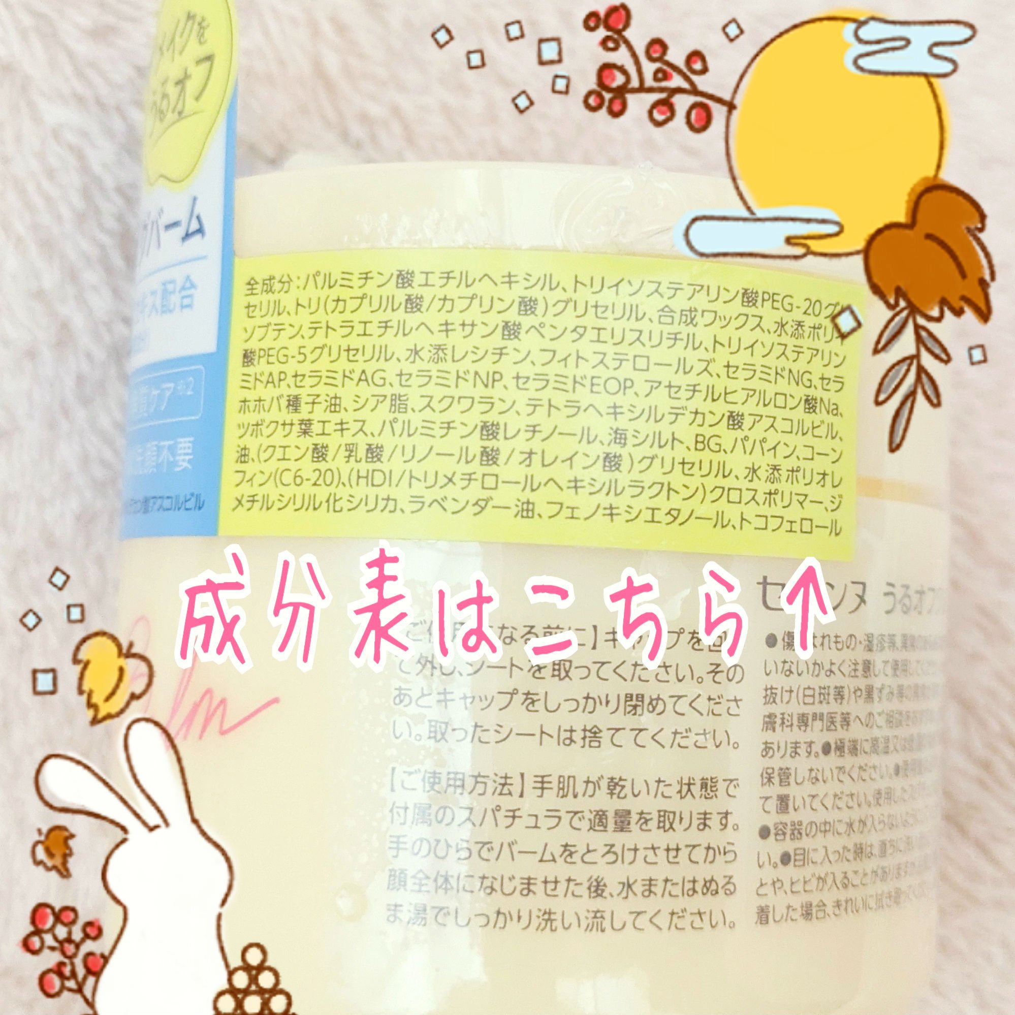 - <90g> BG、フェノキシエタノール、スクワラン、トコフェロール、ホホバ種子油、シア脂、ラベンダー油、セラミドNG、水添レシチン、パルミチン酸エチルヘキシル、アセチルヒアルロン酸Na、セラミドNP、セラミドAP、セラミドEOP、水添ポリイソブテン、テトラヘキシルデカン酸アスコルビル、パルミチン酸レチノール、コーン油、フィトステロールズ、海シルト、トリ(カプリル酸/カプリン酸)グリセリル、トリイソステアリン酸PEG-20グリセリル、トリイソステアリン酸PEG-5グリセリル、テトラエチルヘキサン酸ペンタエリスリチル、パパイン、水添ポリオレフィン(C6-20)、(HDI/トリメチロールヘキシルラクトン)クロスポリマー、セラミドAG、ツボクサ葉エキス、合成ワックス、ジメチルシリル化シリカ、(クエン酸/乳酸/リノール酸/オレイン酸)グリセリル